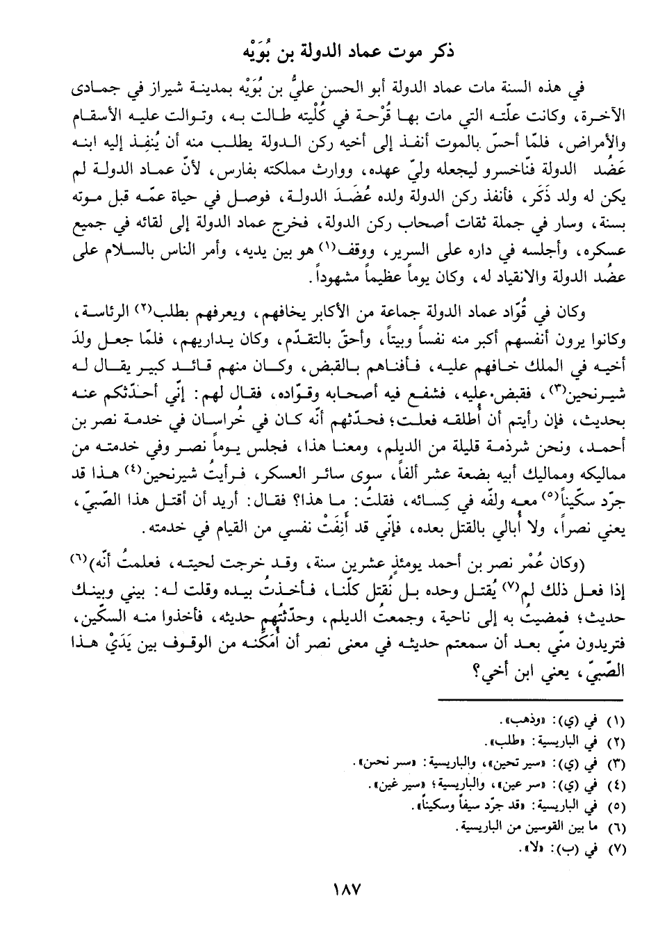 وَكَانَ فِي قُوَّادِ عِمَادِ الدَّوْلَةِ جَمَاعَةٌ مِنَ الْأَكَابِرِ يَخَافُهُمْ، وَيَعْرِفُهُمْ بِطَلَبِ الرِّئَاسَةِ، وَكَانُوا يَرَوْنَ أَنْفُسَهُمْ أَكْبَرَ مِنْهُ نَفْسًا وَبَيْتًا، وَأَحَقَّ بِالتَّقَدُّمِ، وَكَانَ يُدَارِيهِمْ، فَلَمَّا جَعَلَ وَلَدَ أَخِيهِ فِي الْمُلْكِ، خَافَهُمْ عَلَيْهِ، فَأَفْنَاهُمْ بِالْقَبْضِ، وَكَانَ مِنْهُمْ قَائِدٌ كَبِيرٌ يُقَالُ لَهُ شَيْرَنْحِينُ، فَقَبَضَ عَلَيْهِ، فَشَفَعَ فِيهِ أَصْحَابُهُ وَقُوَّادُهُ، فَقَالَ لَهُمْ: إِنِّي أُحَدِّثُكُمْ عَنْهُ بِحَدِيثٍ، فَإِنْ رَأَيْتُمْ أَنْ أُطْلِقَهُ فَعَلْتُ، فَحَدَّثَهُمْ أَنَّهُ كَانَ فِي خُرَاسَانَ فِي خِدْمَةِ نَصْرِ بْنِ أَحْمَدَ، وَنَحْنُ شِرْذِمَةٌ قَلِيلَةٌ مِنَ الدَّيْلَمِ، وَمَعَنَا هَذَا، فَجَلَسَ يَوْمًا نَصْرٌ وَفِي خِدْمَتِهِ مِنْ مَمَالِيكِهِ وَمَمَالِيكِ أَبِيهِ بِضْعَةَ عَشَرَ أَلْفًا سِوَى سَائِرِ الْعَسْكَرِ، فَرَأَيْتُ شَيْرَنْحِينَ هَذَا قَدْ جَرَّدَ سِكِّينًا مَعَهُ وَلَفَّهُ فِي كِسَائِهِ، فَقُلْتُ: مَا هَذَا؟ فَقَالَ: أُرِيدُ أَنَّ أَقْتُلَ هَذَا الصَّبِيَّ، يَعْنِي نَصْرًا، وَلَا أُبَالِيَ بِالْقَتْلِ بَعْدَهُ، فَإِنِّي قَدْ أَنِفَتْ نَفْسِي مِنَ الْقِيَامِ فِي خِدْمَتِهِ.