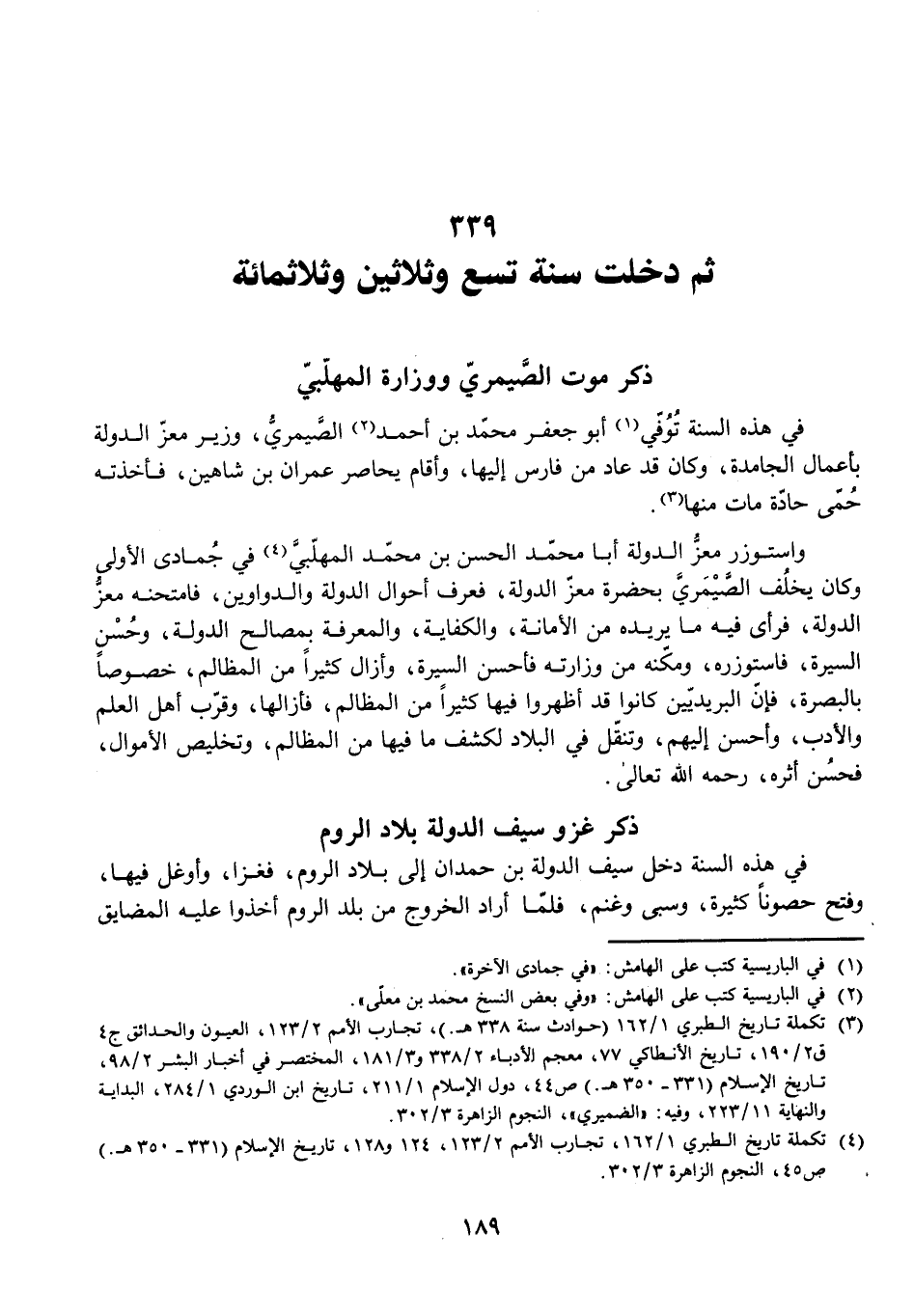 فِي هَذِهِ السَّنَةِ تُوُفِّيَ أَبُو جَعْفَرٍ مُحَمَّدُ بْنُ أَحْمَدَ الصَّيْمَرِيُّ، وَزِيرُ مُعِزِّ الدَّوْلَةِ بِأَعْمَالِ الْجَامِدَةِ، وَكَانَ قَدْ عَادَ مِنْ فَارِسَ إِلَيْهَا، وَأَقَامَ يُحَاصِرُ عِمْرَانَ بْنَ شَاهِينَ، فَأَخَذَتْهُ حُمَّى حَادَّةٌ مَاتَ مِنْهَا.