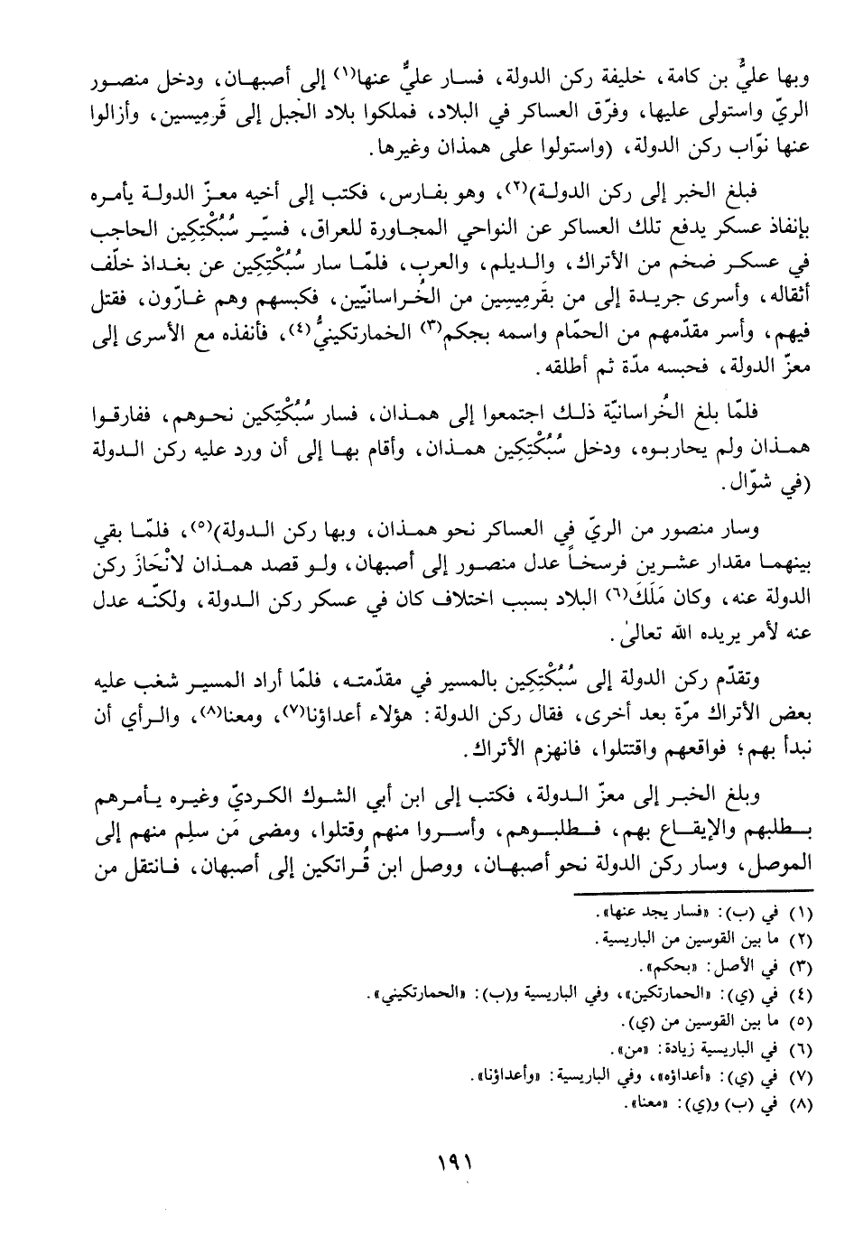 وَسَارَ مَنْصُورٌ مِنَ الرَّيِّ فِي الْعَسَاكِرِ نَحْوَ هَمَذَانَ، وَبِهَا رُكْنُ الدَّوْلَةِ) ، فَلَمَّا بَقِيَ بَيْنَهُمَا مِقْدَارُ عِشْرِينَ فَرْسَخًا، عَدَلَ مَنْصُورٌ إِلَى أَصْبَهَانَ، وَلَوْ قَصَدَ هَمَذَانَ، لَانْحَازَ رُكْنُ الدَّوْلَةِ عَنْهُ، وَكَانَ مَلَكَ الْبِلَادَ بِسَبَبِ اخْتِلَافٍ كَانَ فِي عَسْكَرِ رُكْنِ الدَّوْلَةِ، وَلَكِنَّهُ عَدَلَ عَنْهُ لِأَمْرٍ يُرِيدُهُ اللَّهُ - تَعَالَى، وَتَقَدَّمَ رُكْنُ الدَّوْلَةِ إِلَى سُبُكْتِكِينَ بِالْمَسِيرِ فِي مُقَدِّمَتِهِمْ، فَلَمَّا أَرَادَ الْمَسِيرَ، شَغَبَ عَلَيْهِ بَعْضُ الْأَتْرَاكِ مَرَّةً بَعْدَ أُخْرَى، فَقَالَ رُكْنُ الدَّوْلَةِ: هَؤُلَاءِ أَعْدَاؤُنَا وَمَعَنَا، وَالرَّأْيُ أَنْ نَبْدَأَ بِهِمْ، فَوَاقَعَهُمْ وَاقْتَتَلُوا، فَانْهَزَمَ الْأَتْرَاكُ.