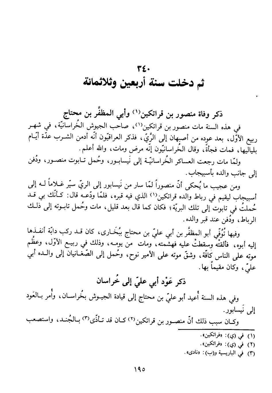 فِي هَذِهِ السَّنَةِ مَاتَ مَنْصُورُ بْنُ قَرَاتَكِينَ صَاحِبُ الْجُيُوشِ الْخُرَاسَانِيَّةِ فِي شَهْرِ رَبِيعٍ الْأَوَّلِ، بَعْدَ عَوْدِهِ مِنْ أَصْبَهَانَ إِلَى الرَّيِّ، فَذَكَرَ الْعِرَاقِيُّونَ أَنَّهُ أَدْمَنَ الشُّرْبَ عِدَّةَ أَيَّامٍ بِلَيَالِيهَا، فَمَاتَ فَجْأَةً، وَقَالَ الْخُرَاسَانِيُّونَ: إِنَّهُ مَرِضَ وَمَاتَ، وَاللَّهُ أَعْلَمُ.