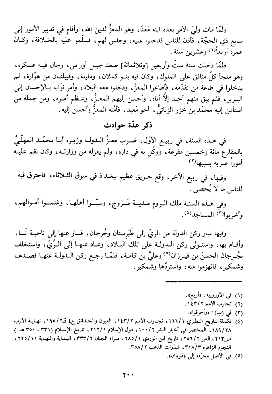 فِي هَذِهِ السَّنَةِ فِي رَبِيعٍ الْأَوَّلِ، ضَرَبَ مُعِزُّ الدَّوْلَةِ وَزِيرَهُ أَبَا مُحَمَّدٍ الْمُهَلَّبِيَّ بِالْمَقَارِعِ مِائَةً وَخَمْسِينَ مِقْرَعَةً، وَوَكَّلَ بِهِ فِي دَارِهِ وَلَمْ يَعْزِلْهُ مِنْ وِزَارَتِهِ، وَكَانَ نَقِمَ عَلَيْهِ أُمُورًا ضَرْبَهُ بِسَبَبِهَا.