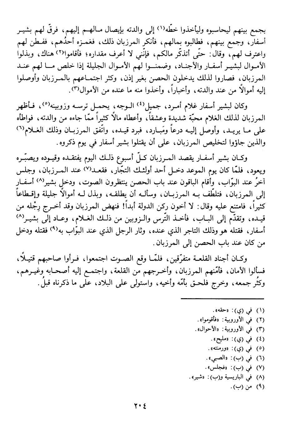 يَجْمَعَ بَيْنَهُمْ لِيُحَاسِبُوهُ وَلِيَأْخُذُوا خَطَّهُ إِلَى وَالِدَتِهِ بِإِيصَالِ مَا لَهُمْ إِلَيْهِمْ، فَرَقَّ لَهُمْ بَشِيرُ أَسْفَارٍ وَجَمَعَ بَيْنَهُمْ، فَطَالَبُوهُ بِمَالِهِمْ، فَأَنْكَرَ الْمَرْزُبَانُ ذَلِكَ، فَغَمَزَهُ أَحَدُهُمْ، فَفَطِنَ لَهُمْ وَاعْتَرَفَ لَهُمْ، وَقَالَ: حَتَّى أَتَذَكَّرَ مَالَكُمْ، فَإِنَّنِي لَا أَعْرِفُ مِقْدَارَهُ، فَأَقَامُوا هُنَاكَ، وَبَذَلُوا الْأَمْوَالَ لِبَشِيرِ أَسْفَارٍ وَالْأَجْنَادِ، وَضَمِنُوا لَهُمُ الْأَمْوَالَ الْجَلِيلَةَ إِذَا خَلُصَ مَا لَهُمْ عِنْدَ الْمَرْزُبَانِ، فَصَارُوا لِذَلِكَ يَدْخُلُونَ الْحِصْنَ بِغَيْرِ إِذْنٍ، وَكَثُرَ اجْتِمَاعُهُمْ بِالْمَرْزُبَانِ وَأَوْصَلُوا إِلَيْهِ أَمْوَالًا مِنْ عِنْدِ وَالِدَتِهِ، وَأَخْبَارًا، وَأَخَذُوا مِنْهُ مَا عِنْدَهُ مِنَ الْأَمْوَالِ.