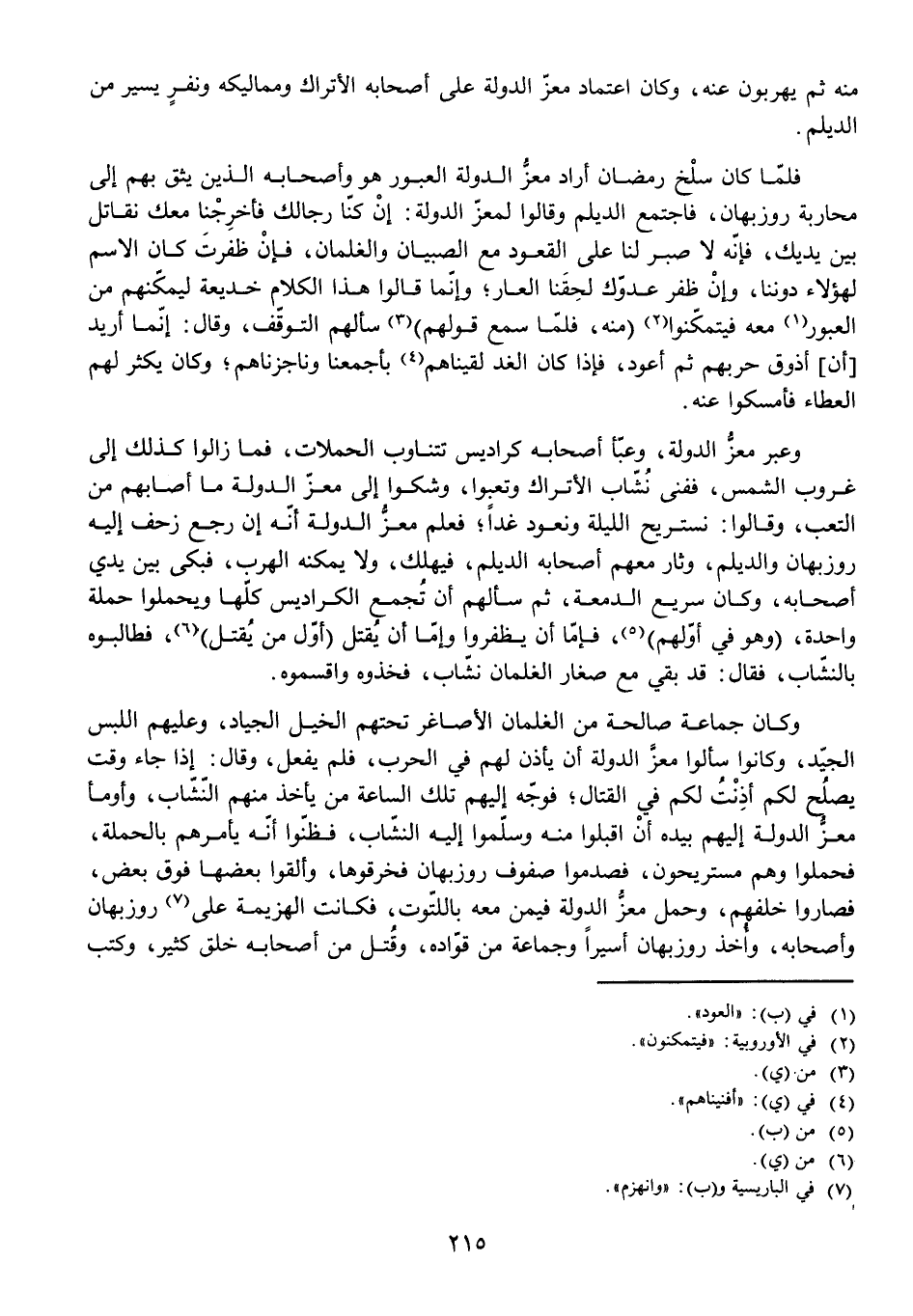 فَلَمَّا كَانَ سَلْخُ رَمَضَانَ، أَرَادَ مُعِزُّ الدَّوْلَةِ الْعُبُورَ هُوَ وَأَصْحَابُهُ الَّذِينَ يَثِقُ بِهِمْ إِلَى مُحَارَبَةِ رُوزْبَهَانَ، فَاجْتَمَعَ الدَّيْلَمُ وَقَالُوا لِمُعِزِّ الدَّوْلَةِ: إِنْ كُنَّا رِجَالَكَ، فَأَخْرِجْنَا مَعَكَ نُقَاتِلْ بَيْنَ يَدَيْكَ، فَإِنَّهُ لَا صَبْرَ لَنَا عَلَى الْقُعُودِ مَعَ الصِّبْيَانِ وَالْغِلْمَانِ، فَإِنْ ظَفِرْتَ كَانَ الِاسْمُ لِهَؤُلَاءِ دُونَنَا، وَإِنْ ظَفِرَ عَدُوُّكَ لَحِقَنَا الْعَارُ، وَإِنَّمَا قَالُوا هَذَا الْكَلَامَ خَدِيعَةً لِيُمَكِّنَهُمْ مِنَ الْعُبُورِ مَعَهُ فَيَتَمَكَّنُوا (مِنْهُ، فَلَمَّا سَمِعَ قَوْلَهُمْ) سَأَلَهُمُ التَّوَقُّفَ، وَقَالَ: إِنَّمَا أُرِيدُ [أَنْ] أَذُوقَ حَرْبَهُمْ ثُمَّ أَعُودُ، فَإِذَا كَانَ الْغَدُ لَقِينَاهُمْ بِأَجْمَعِنَا وَنَاجَزْنَاهُمْ، وَكَانَ يُكْثِرُ لَهُمُ الْعَطَاءَ فَأَمْسَكُوا عَنْهُ.