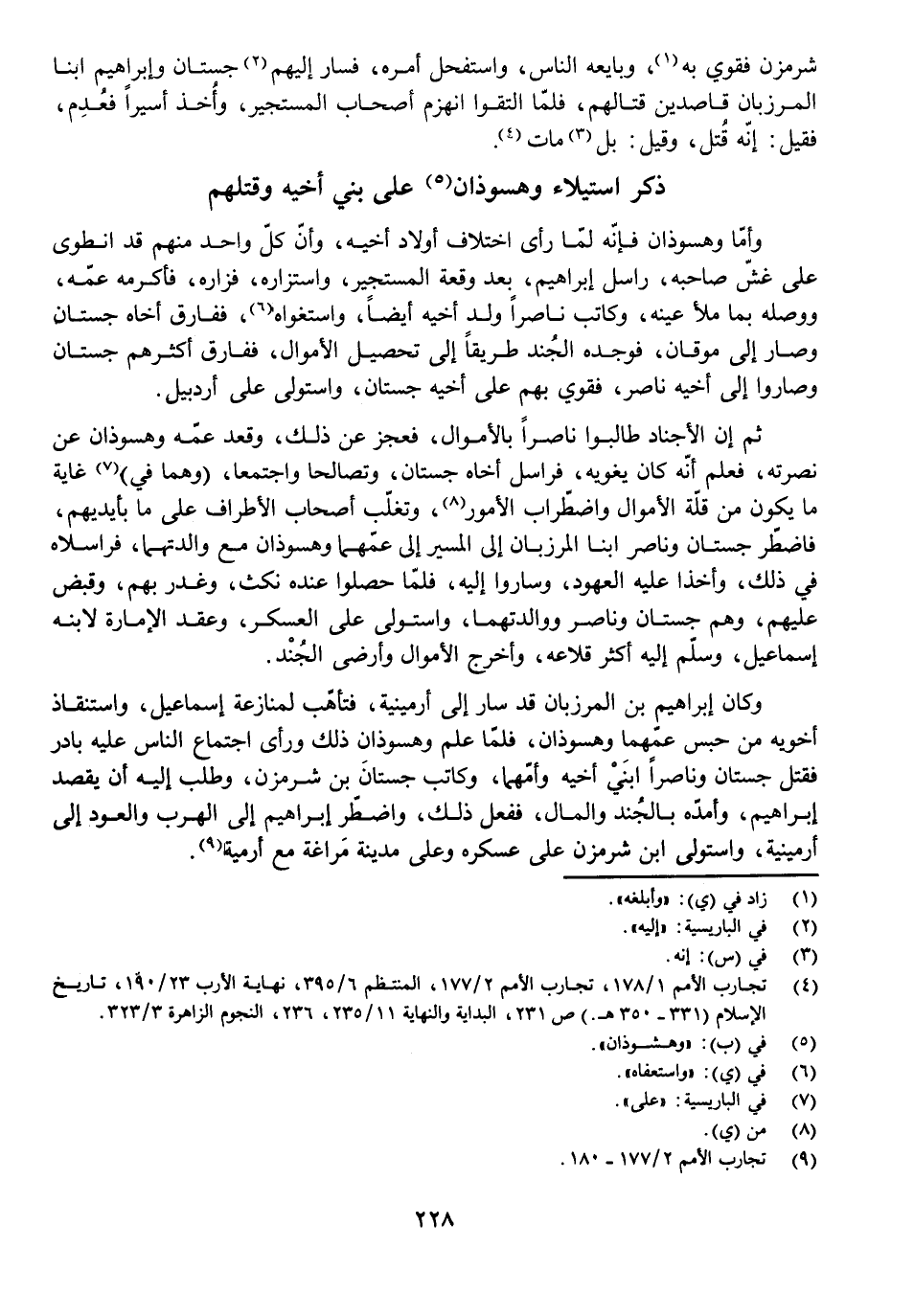 وَكَانَ إِبْرَاهِيمُ بْنُ الْمَرْزُبَانِ قَدْ سَارَ إِلَى أَرْمِينِيَّةَ، فَتَأَهَّبَ لِمُنَازَعَةِ إِسْمَاعِيلَ وَاسْتِنْفَاذِ أَخَوَيْهِ مِنْ حَبْسِ عَمِّهِمَا وَهْسُوذَانَ، فَلَمَّا عَلِمَ وَهْسُوذَانُ ذَلِكَ وَرَأَى اجْتِمَاعَ النَّاسِ عَلَيْهِ، بَادَرَ فَقَتَلَ جِسْتَانَ وَنَاصِرًا ابْنَيْ أَخِيهِ وَأُمَّهُمَا، وَكَاتَبَ جِسْتَانَ بْنَ شَرْمِزَنَّ، وَطَلَبَ إِلَيْهِ أَنْ يَقْصِدَ إِبْرَاهِيمَ، وَأَمَدَّهُ بِالْجُنْدِ وَالْمَالِ، فَفَعَلَ ذَلِكَ، وَاضْطُرَّ إِبْرَاهِيمُ إِلَى الْهَرَبِ وَالْعَوْدِ إِلَى أَرْمِينِيَّةَ، وَاسْتَوْلَى ابْنُ شَرْمِزَنَّ عَلَى عَسْكَرِهِ وَعَلَى مَدِينَةِ مَرَاغَةَ مَعَ أُرْمِيَةَ.