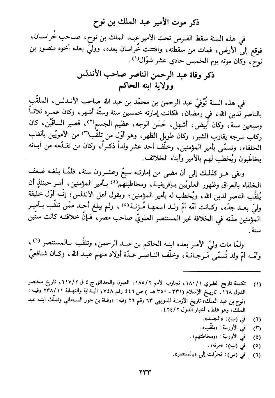 فِي هَذِهِ السَّنَةِ تُوُفِّيَ عَبْدُ الرَّحْمَنِ بْنُ مُحَمَّدِ بْنِ عَبْدِ اللَّهِ صَاحِبُ الْأَنْدَلُسِ، الْمُلَقَّبُ بِالنَّاصِرِ لِدِينِ اللَّهِ، فِي رَمَضَانَ، فَكَانَتْ إِمَارَتُهُ خَمْسِينَ سَنَةً وَسِتَّةَ أَشْهُرٍ، وَكَانَ عُمُرُهُ ثَلَاثًا وَسَبْعِينَ سَنَةً، كَانَ أَبْيَضَ، أَشْهَلَ، حَسَنَ الْوَجْهِ، عَظِيمَ الْجِسْمِ، قَصِيرَ السَّاقَيْنِ، كَانَ رِكَابُ سَرْجِهِ يُقَارِبُ الشِّبْرَ، وَكَانَ طَوِيلَ الظَّهْرِ، وَهُوَ أَوَّلُ مَنْ تَلَقَّبَ مِنَ الْأُمَوِيِّينَ بِأَلْقَابِ الْخُلَفَاءِ، تَسَمَّى بِأَمِيرِ الْمُؤْمِنِينَ، وَخَلَّفَ أَحَدَ عَشَرَ وَلَدًا ذَكَرًا، وَكَانَ مَنْ تَقَدَّمَهُ مِنْ آبَائِهِ يُخَاطَبُونَ وَيُخْطَبُ لَهُمْ بِالْأَمِيرِ وَأَبْنَاءِ الْخَلَائِفِ.