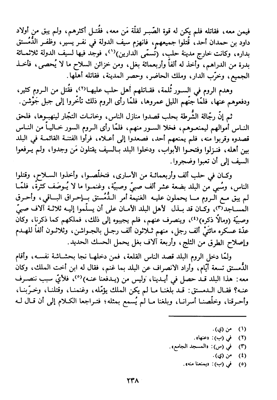 ثُمَّ إِنَّ رِجَّالَةَ الشُّرْطَةِ بِحَلَبَ قَصَدُوا مَنَازِلَ النَّاسِ، وَخَانَاتِ التُّجَّارِ لِيَنْهَبُوهَا، فَلَحِقَ النَّاسُ أَمْوَالَهُمْ لِيَمْنَعُوهَا، فَخَلَا السُّورُ مِنْهُمْ، فَلَمَّا رَأَى الرُّومُ السُّورَ خَالِيًا مِنَ النَّاسِ، قَصَدُوهُ وَقَرُبُوا مِنْهُ، فَلَمْ يَمْنَعْهُمْ أَحَدٌ، فَصَعِدُوا إِلَى أَعْلَاهُ، فَرَأَوُا الْفِتْنَةَ قَائِمَةً فِي الْبَلَدِ بَيْنَ أَهْلِهِ، فَنَزَلُوا وَفَتَحُوا الْأَبْوَابَ، وَدَخَلُوا الْبَلَدَ بِالسَّيْفِ يَقْتُلُونَ مَنْ وَجَدُوا، وَلَمْ يَرْفَعُوا السَّيْفَ إِلَى أَنْ تَعِبُوا وَضَجِرُوا.
