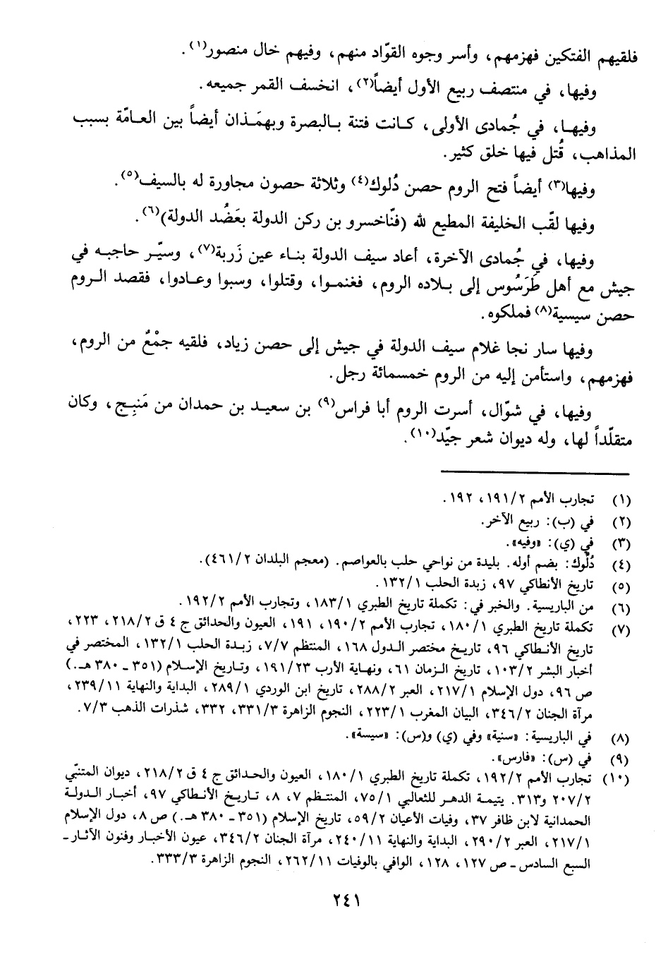 وَفِيهَا فِي جُمَادَى الْآخِرَةِ، أَعَادَ سَيْفُ الدَّوْلَةِ بِنَاءَ عَيْنِ زَرْبَةَ، وَسَيَّرَ حَاجِبَهُ فِي جَيْشٍ مَعَ أَهْلِ طَرَسُوسَ إِلَى بِلَادِ الرُّومِ، فَغَنِمُوا، وَقَتَلُوا، وَسَبَوْا وَعَادُوا، فَقَصَدَ الرُّومُ حِصْنَ سَيْسِيَّةَ فَمَلَكُوهُ.