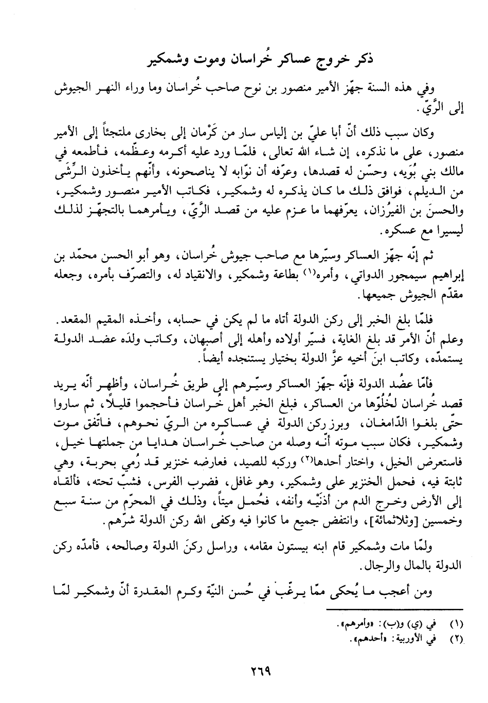 فَأَمَّا عَضُدُ الدَّوْلَةِ فَإِنَّهُ جَهَّزَ الْعَسَاكِرَ وَسَيَّرَهُمْ إِلَى طَرِيقِ خُرَاسَانَ، وَأَظْهَرَ أَنَّهُ يُرِيدُ قَصْدَ خُرَاسَانَ لِخُلُوِّهَا مِنَ الْعَسَاكِرِ، فَبَلَغَ الْخَبَرُ أَهْلَ خُرَاسَانَ فَأَحْجَمُوا قَلِيلًا، ثُمَّ سَارُوا حَتَّى بَلَغُوا الدَّامَغَانَ، وَبَرَزَ رُكْنُ الدَّوْلَةِ فِي عَسَاكِرِهِ مِنَ الرَّيِّ نَحْوَهُمْ، فَاتَّفَقَ مَوْتَ وَشْمِكِيرَ، فَكَانَ سَبَبُ مَوْتِهِ أَنَّهُ وَصَلَهُ مِنْ صَاحِبِ خُرَاسَانَ هَدَايَا مِنْ جُمْلَتِهَا خَيْلٌ، فَاسْتَعْرَضَ الْخَيْلَ وَاخْتَارَ أَحَدَهَا وَرَكِبَهُ لِلصَّيْدِ، فَعَارَضَهُ خِنْزِيرٌ قَدْ رُمِيَ بِحَرْبَةٍ، وَهِيَ ثَابِتَةٌ فِيهِ، فَحَمَلَ الْخِنْزِيرُ عَلَى وَشْمَكِيرَ، وَهُوَ غَافِلٌ، فَضَرَبَ الْفَرَسَ، فَشَبَّ تَحْتَهُ، فَأَلْقَاهُ إِلَى الْأَرْضِ، وَخَرَجَ الدَّمُ مِنْ أُذُنَيْهِ وَأَنْفِهِ، فَحُمِلَ مَيِّتًا، وَذَلِكَ فِي الْمُحَرَّمِ مِنْ سَنَةِ سَبْعٍ وَخَمْسِينَ [وَثَلَاثِمِائَةٍ] ، وَانْتَقَضَ جَمِيعُ مَا كَانُوا فِيهِ، وَكَفَى اللَّهُ رُكْنَ الدَّوْلَةِ شَرَّهُمْ.