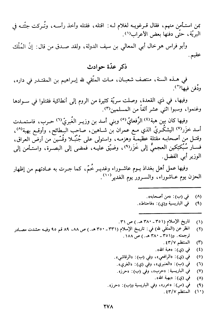 وَفِيهَا كَانَ بَيْنَ هِبَةِ الرِّفْعَايِّ وَبَنِي أَسَدِ بْنِ وَزِيرِ الْغُبَرِيِّ حَرْبٌ، فَاسْتَمَدَّتْ أَسَدٌ خَزَرَ الْيَشْكُرِيَّ الَّذِي مَعَ عِمْرَانَ بْنِ شَاهِينَ، صَاحِبِ الْبَطَائِحِ، وَأَوْقَعَ بِهِبَةَ، وَقَتَلَ مِنْ أَصْحَابِهِ مَقْتَلَةً عَظِيمَةً وَهَزَمَهُ، وَاسْتَوْلَى عَلَى جُنْبُلَا وَقُسِّينَ مِنْ أَرْضِ الْعِرَاقِ، فَسَارَ سُبُكْتِكِينُ الْعَجَمِيُّ إِلَى خَزَرٍ، وَضَيَّقَ عَلَيْهِ، فَمَضَى إِلَى الْبَصْرَةِ وَاسْتَأْمَنَ إِلَى الْوَزِيرِ أَبِي الْفَضْلِ، وَفِيهَا عَمِلَ أَهْلُ بَغْدَاذَ يَوْمَ عَاشُورَاءَ وَغَدِيرَ خُمٍّ، كَمَا جَرَتْ بِهِ عَادَتُهُمْ مِنْ إِظْهَارِ الْحُزْنِ يَوْمَ عَاشُورَاءَ، وَالسُّرُورِ يَوْمَ الْغَدِيرِ،
