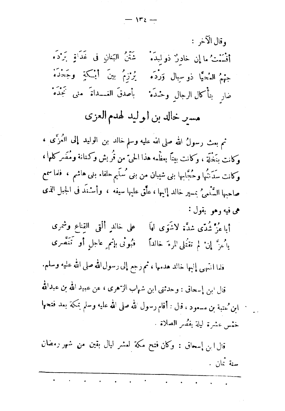 ثُمّ بعث رسول الله صلى الله عليه وسلم خَالِدَ بْنَ الْوَلِيدِ إلَى الْعُزّى، وَكَانَتْ بِنَخْلَةَ، وَكَانَتْ بَيْتًا يُعَظّمُهُ هَذَا الْحَيّ مِنْ قُرَيْشٍ وَكِنَانَةَ وَمُضَرَ كُلّهَا، وَكَانَتْ سَدَنَتُهَا وَحُجّابُهَا بَنِي شَيْبَانَ مِنْ بَنِي سُلَيْمٍ حَلْفَاءِ بَنِي هَاشِمٍ، فَلَمّا سَمِعَ صَاحِبُهَا السّلَمِيّ بِمَسِيرِ خَالِدٍ إلَيْهَا، عَلّقَ عَلَيْهَا سَيْفَهُ، وَأَسْنَدَ فِي الْجَبَلِ الّذِي هى فيه وهو يقول: