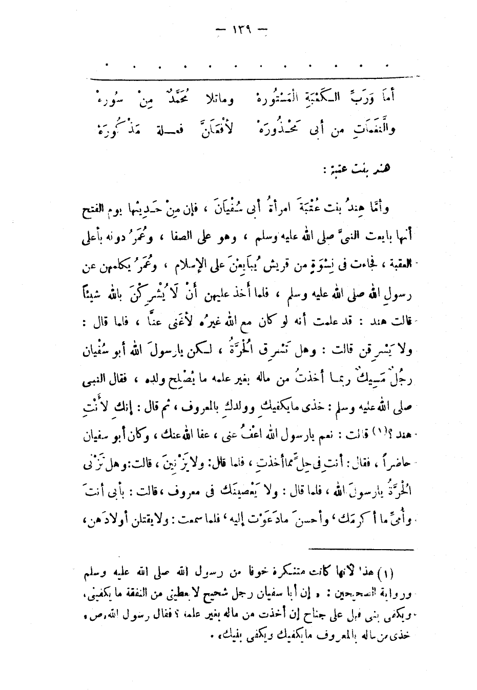 وَأَمّا هِنْدُ بِنْتُ عُتْبَةَ امْرَأَةُ أَبِي سُفْيَانَ، فَإِنّ مِنْ حَدِيثِهَا يَوْمَ الْفَتْحِ أَنّهَا بَايَعَتْ النّبِيّ صَلَّى اللَّهُ عَلَيْهِ وَسَلَّمَ، وَهُوَ عَلَى الصّفَا، وَعُمَرُ دُونَهُ بِأَعْلَى الْعَقَبَةِ، فَجَاءَتْ فِي نِسْوَةٍ مِنْ قُرَيْشٍ يُبَايِعْنَ عَلَى الْإِسْلَامِ، وَعُمَرُ يُكَلّمُهُنّ عَنْ رَسُولِ اللهِ صَلَّى اللَّهُ عَلَيْهِ وَسَلَّمَ، فَلَمّا أَخَذَ عَلَيْهِنّ أَنْ لَا يُشْرِكْنَ بِاَللهِ شَيْئًا قَالَتْ هِنْدُ: قَدْ عَلِمْت أَنّهُ لَوْ كَانَ مَعَ اللهِ غَيْرُهُ لَأَغْنَى عَنّا، فَلَمّا قَالَ: