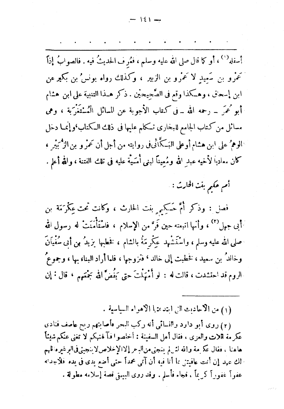 فَصْلٌ: وَذَكَرَ أُمّ حَكِيمٍ بِنْتَ الْحَارِثِ، وَكَانَتْ تَحْتَ عِكْرِمَةَ بْنِ أَبِي جَهْلٍ «2» ، وَأَنّهَا اتّبَعَتْهُ حِينَ فَرّ مِنْ الْإِسْلَامِ، فَاسْتَأْمَنَتْ لَهُ رَسُولَ اللهِ صَلَّى اللَّهُ عَلَيْهِ وَسَلَّمَ، وَاسْتُشْهِدَ عِكْرِمَةُ بِالشّامِ، فَخَطَبَهَا يَزِيدُ بْنُ أَبِي سُفْيَانَ وَخَالِدُ بْنُ سَعِيدٍ، فَخُطِبَتْ إلَى خَالِدٍ، فَتَزَوّجَهَا، فَلَمّا أَرَادَ الْبِنَاءَ بِهَا، وَجُمُوعُ الرّومِ قَدْ احْتَشَدَتْ، قَالَتْ لَهُ: لَوْ أَمْهَلْت حتى يفضّ الله جمعهم، قال: إن