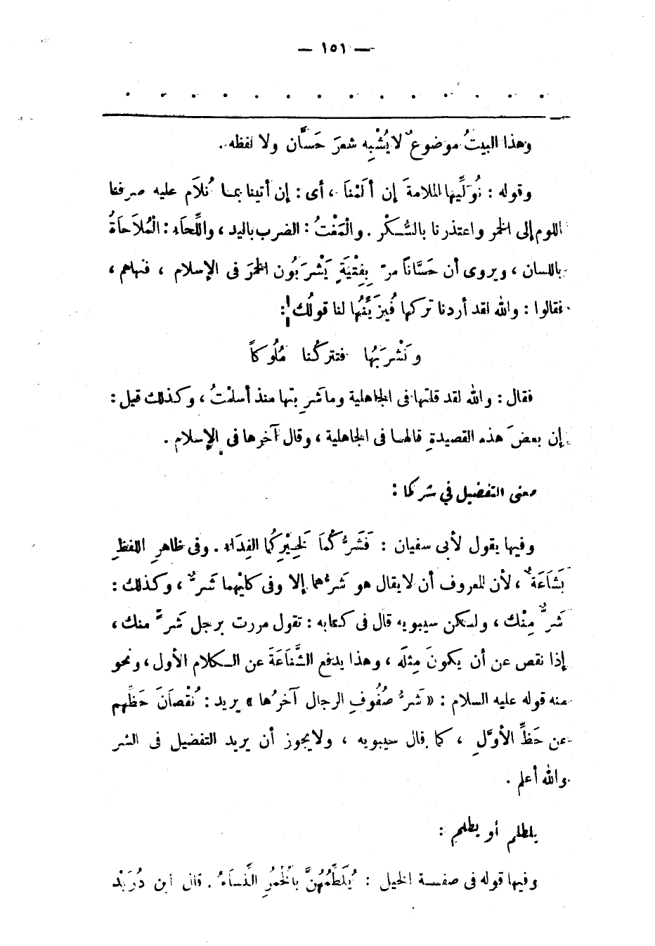 وَقَوْلُهُ: نُوَلّيهَا الْمَلَامَةَ إنْ أَلَمْنَا، أَيْ: إنْ أَتَيْنَا بِمَا نُلَامُ عَلَيْهِ صَرَفْنَا اللّوْمَ إلَى الْخَمْرِ وَاعْتَذَرْنَا بِالسّكْرِ. وَالْمَغْتُ: الضّرْبُ بِالْيَدِ، وَاللّحَاءُ: الْمُلَاحَاةُ بِاللّسَانِ، وَيُرْوَى أَنّ حَسّانًا مَرّ بِفِتْيَةِ يَشْرَبُونَ الْخَمْرَ فِي الْإِسْلَامِ، فَنَهَاهُمْ، فَقَالُوا: وَاَللهِ لَقَدْ أَرَدْنَا تَرْكَهَا فَيُزَيّنُهَا لَنَا قَوْلُك:
