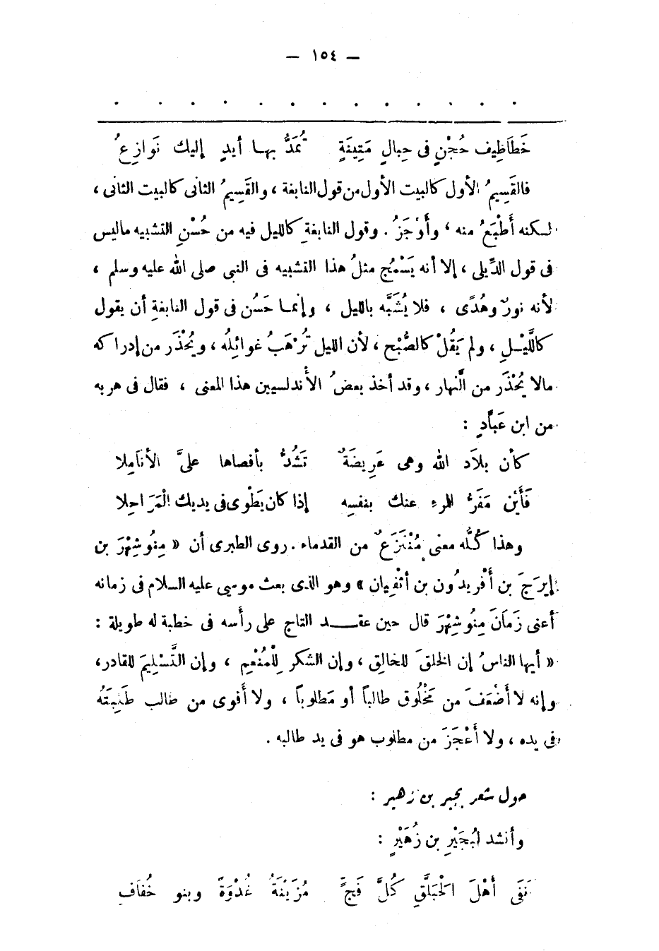 فَالْقَسِيمُ الْأَوّلُ كَالْبَيْتِ الْأَوّلِ من قول النابغة، وَالْقَسِيمُ الثّانِي كَالْبَيْتِ الثّانِي، لَكِنّهُ أَطْبَعُ مِنْهُ، وَأَوْجَزُ. وَقَوْلُ النّابِغَةِ كَاللّيْلِ فِيهِ مِنْ حُسْنِ التّشْبِيهِ مَا لَيْسَ فِي قَوْلِ الدّيلِيّ، إلّا أَنّهُ يَسْمُجُ مِثْلُ هَذَا التّشْبِيهِ فِي النّبِيّ صَلَّى اللَّهُ عَلَيْهِ وَسَلَّمَ، لِأَنّهُ نُورٌ وَهُدًى، فَلَا يُشَبّهُ بِاللّيْلِ، وَإِنّمَا حَسُنَ فِي قَوْلِ النّابِغَةِ أَنْ يَقُولَ كَاللّيْلِ، وَلَمْ يَقُلْ كَالصّبْحِ، لِأَنّ اللّيْلَ تُرْهَبُ غَوَائِلُهُ، وَيُحْذَرُ مِنْ إدْرَاكِهِ مَا لَا يَحْذَرُ مِنْ النّهَارِ، وَقَدْ أَخَذَ بَعْضُ الأندلسيين هَذَا الْمَعْنَى، فَقَالَ فِي هَرَبِهِ مِنْ ابْنِ عَبّادٍ: