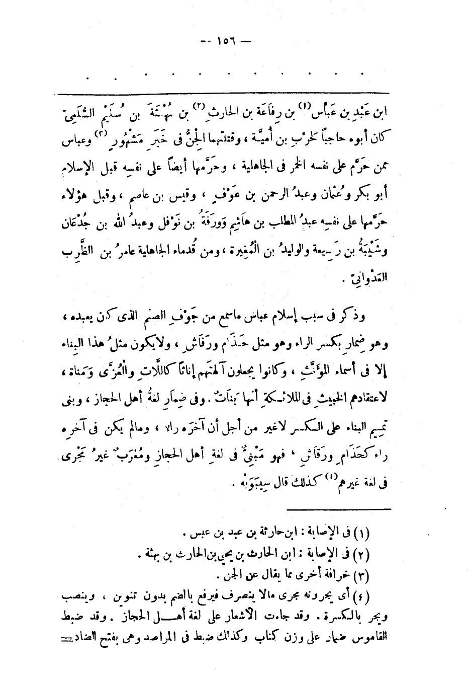وَذَكَرَ فِي سَبَبِ إسْلَامِ عَبّاسٍ مَا سَمِعَ مِنْ جَوْفِ الصّنَمِ الّذِي كَانَ يَعْبُدُهُ، وَهُوَ ضَمَارِ بكسر الراء وهو مثل حذام ورفاش، وَلَا يَكُونُ مِثْلُ هَذَا الْبِنَاءِ إلّا فِي أسماء المؤنّث، وكانوا يجعلون آلهتهم إناثا كاللّات وَالْعُزّى وَمَنَاةَ، لِاعْتِقَادِهِمْ الْخَبِيثَ فِي الْمَلَائِكَةِ أَنّهَا بَنَاتٌ. وَفِي ضَمَارِ لُغَةُ أَهْلِ الْحِجَازِ، وَبَنِيّ تَمِيمٍ الْبِنَاءُ عَلَى الْكَسْرِ لَا غَيْرُ مِنْ أَجْلِ أَنّ آخِرَهُ رَاءٌ، وَمَا لَمْ يَكُنْ فِي آخِرِهِ رَاءٌ كَحَذَامِ وَرَقَاشِ، فَهُوَ مَبْنِيّ فِي لُغَةِ أَهْلِ الْحِجَازِ وَمُعْرَبٌ غَيْرُ مُجْرًى فى لغة غيرهم «4» كذلك قال سيبويه.