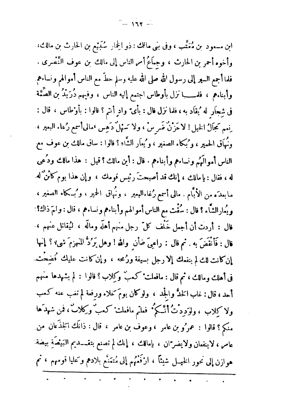 نِعْمَ مَجَالُ الْخَيْلِ! لَا حزن ضرس، ولا سهل دهس، مالى أسمع رعاء الْبَعِيرِ، وَنُهَاقَ الْحَمِيرِ، وَبُكَاءَ الصّغِيرِ، وَيُعَارَ الشّاءِ؟ قَالُوا: سَاقَ مَالِكُ بْنُ عَوْفٍ مَعَ النّاسِ أَمْوَالَهُمْ وَنِسَاءَهُمْ وَأَبْنَاءَهُمْ. قَالَ: أَيْنَ مَالِكٌ؟ قِيلَ: هَذَا مَالِكٌ وَدُعِيَ لَهُ، فَقَالَ: يَا مَالِكُ، إنّك قَدْ أَصْبَحْتَ رَئِيسَ قَوْمِك، وَإِنّ هَذَا يَوْمٌ كَائِنٌ لَهُ مَا بَعْدَهُ مِنْ الْأَيّامِ. مَالِي أَسْمَعُ رُغَاءَ الْبَعِيرِ، وَنُهَاقَ الْحَمِيرِ، وَبُكَاءَ الصّغِيرِ، وَيُعَارَ الشّاءِ؟ قَالَ: سُقْت مَعَ النّاسِ أَمْوَالَهُمْ وَأَبْنَاءَهُمْ وَنِسَاءَهُمْ، قَالَ: وَلِمَ ذَاكَ؟