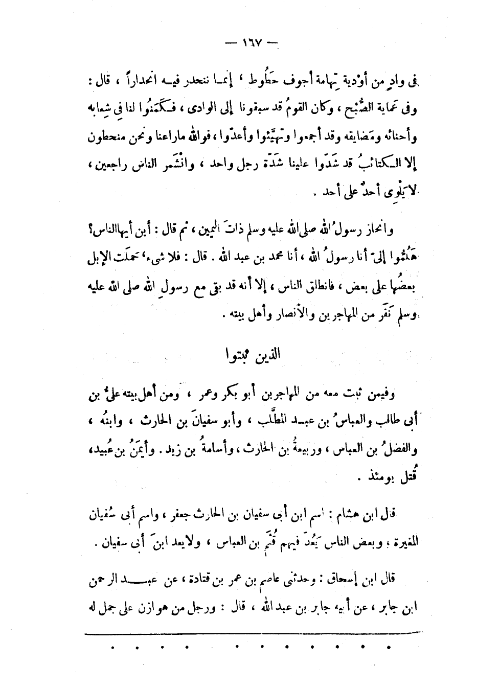 هَلُمّوا إلَيّ أَنَا رَسُولُ اللهِ، أَنَا مُحَمّدُ بْنُ عَبْدِ اللهِ. قَالَ: فَلَا شَيْءَ، حَمَلَتْ الْإِبِلُ بَعْضُهَا عَلَى بَعْضٍ، فَانْطَلَقَ النّاسُ، إلّا أَنّهُ قَدْ بَقِيَ مَعَ رَسُولِ اللهِ صَلَّى اللَّهُ عَلَيْهِ وَسَلَّمَ نَفَرٌ مِنْ الْمُهَاجِرِينَ وَالْأَنْصَارِ وَأَهْلِ بيته.