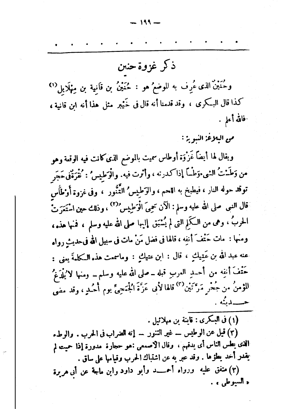 وَيُقَالُ لَهَا أَيْضًا غَزْوَةُ أَوْطَاسٍ سُمّيَتْ بِالْمَوْضِعِ الّذِي كَانَتْ فِيهِ الْوَقْعَةُ وَهُوَ مِنْ وَطَسْت الشّيْءَ وَطْسًا إذَا كَدّرْته، وَأَثّرْت فِيهِ. وَالْوَطِيسُ: نَقْرَةٌ فِي حُجَرٍ تُوقَدُ حَوْلَهُ النّارُ، فَيُطْبَخُ بِهِ اللّحْمُ، وَالْوَطِيسُ التّنّورُ، وَفِي غَزْوَةِ أَوْطَاسٍ قَالَ النّبِيّ صَلَّى اللَّهُ عَلَيْهِ وَسَلَّمَ: الْآنَ حَمِيَ الْوَطِيسُ «2» ، وَذَلِكَ حِينَ اسْتَعَرْت الْحَرْبُ، وَهِيَ مِنْ الْكَلِمِ الّتِي لَمْ يُسْبَقْ إلَيْهَا صَلَّى اللَّهُ عَلَيْهِ وَسَلَّمَ، فَمِنْهَا هَذِهِ، وَمِنْهَا: مَاتَ حَتْفَ أَنْفِهِ، قَالَهَا فِي فَضْلِ مَنْ مَاتَ فِي سَبِيلِ اللهِ فِي حَدِيثٍ رَوَاهُ عَنْهُ عَبْدُ اللهِ بْنُ عَتِيكٍ، قَالَ: ابْنُ عَتِيكٍ: وَمَا سَمِعْت هَذِهِ الْكَلِمَةَ يَعْنِي: