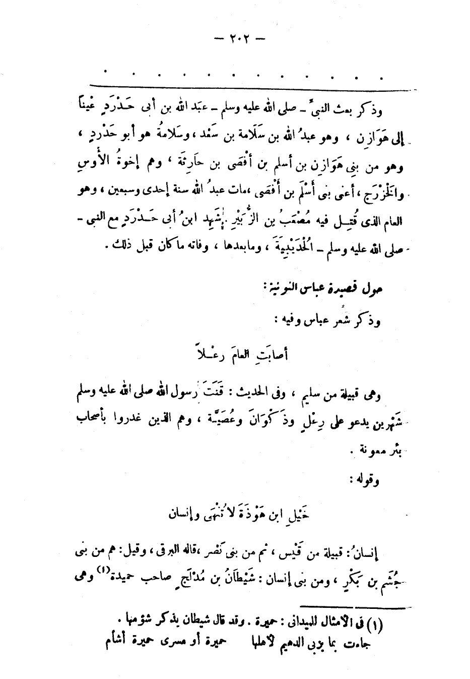 وَذَكَرَ بَعْثَ النّبِيّ- صَلَّى اللَّهُ عَلَيْهِ وَسَلَّمَ- عَبْدَ اللهِ بْنَ أَبِي حَدْرَدٍ عَيْنًا إلَى هَوَازِنَ، وَهُوَ عَبْدُ اللهِ بْنُ سَلَامَةَ بْنِ سَعْدٍ، وَسَلَامَةُ هُوَ أَبُو حَدْرَدٍ، وَهُوَ مِنْ بَنِي هَوَازِنَ بْنِ أَسْلَمَ بْن أَفْصَى بْنِ حَارِثَةَ، وَهُمْ إخْوَةُ الْأَوْسِ وَالْخَزْرَجِ، أَعْنِي بَنِي أَسْلَمَ بْنِ أَفْصَى، مَاتَ عَبْدُ اللهِ سَنَةَ إحْدَى وَسَبْعِينَ، وَهُوَ الْعَامُ الّذِي قُتِلَ فِيهِ مُصْعَبُ بْنُ الزّبَيْرِ. شَهِدَ ابْنُ أَبِي حَدْرَدٍ مَعَ النّبِيّ- صَلَّى اللَّهُ عَلَيْهِ وَسَلَّمَ- الْحُدَيْبِيَةَ، وَمَا بَعْدَهَا، وَفَاتَهُ مَا كَانَ قَبْلَ ذَلِكَ.