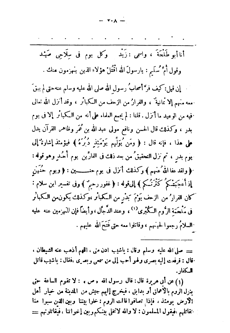 كان الْفِرَارُ مِنْ الزّحْفِ يَوْمَ بَدْرٍ مِنْ الْكَبَائِرِ، وَكَذَلِك يَكُونُ مِنْ الْكَبَائِرِ فِي مَلْحَمَةِ الرّومِ الْكُبْرَى «1» ، وَعِنْدَ الدّجّالِ، وَأَيْضًا فَإِنّ الْمُنْهَزِمِينَ عَنْهُ عَلَيْهِ السّلَامُ رَجَعُوا لِحِينِهِمْ، وَقَاتَلُوا مَعَهُ حَتّى فتح الله عليهم.