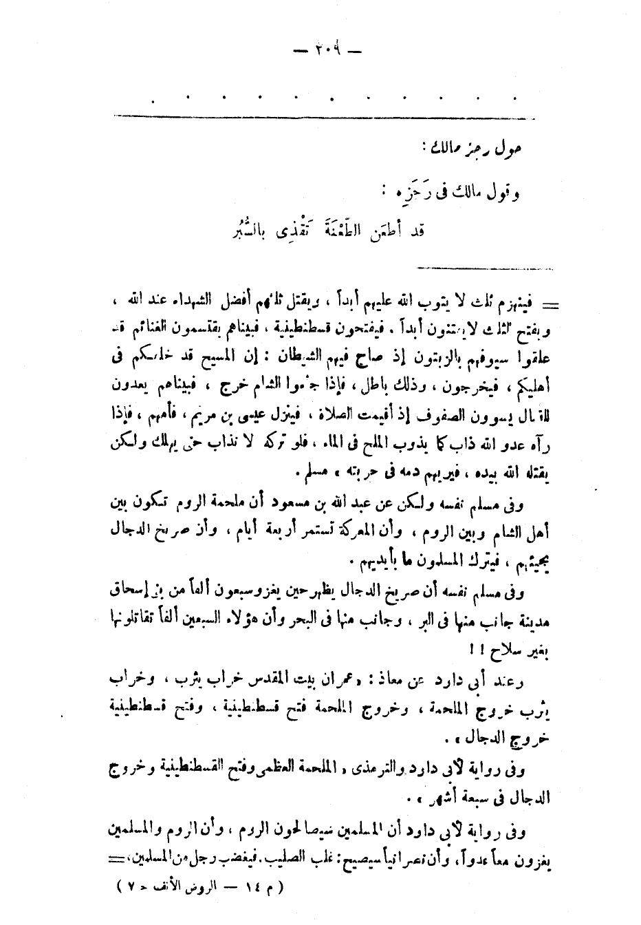 - فينهزم ثلث لا يتوب الله عليهم أبدا، ويقتل ثلثهم أفضل الشهداء عند الله، وبفتح الثلث لا يفتنون أبدا، فيفتحون قسطنطينية، فبيناهم يقتسمون الغنائم قد علقوا سيوفهم بالزيتون إذ صاح فيهم الشيطان: إن المسيح قد خلفكم فى أهليكم، فيخرجون، وذلك باطل، فإذا جاموا الشام خرج، فبيناهم يعدون للقتال يسوون الصفوف إذ أقيمت الصلاة، فينزل عيسى بن مريم، فأمهم، فإذا رآه عدو الله ذاب كما يذوب الملح فى الماء، فلو تركه لا نذاب حتى يهلك ولكن يقتله الله بيده، فيريهم دمه فى حربته» مسلم. وفى مسلم نفسه ولكن عن عبد الله بن مسعود أن ملحمة الروم تكون بين أهل الشام وبين الروم، وأن المعركة تستمر أربعة أيام، وأن صريخ الدجال يجيئهم، فيترك المسلمون ما بأيديهم. وفى مسلم نفسه أن صريخ الدجال يظهر حين يغز وسبعون ألفا من بني إسحاق مدينة جانب منها فى البر، وجانب منها فى البحر وأن هؤلاء السبعين ألفا تقاتلونها بغير سلاح!! وعند أبى داود عن معاذ: «عمران بيت المقدس خراب يثرب، وخراب يثرب خروج الملحمة، وخروج الملحمة فتح قسطنطينية، وفتح قسطنطينية خروج الدجال» . وفى رواية لأبى داود والترمذى «الملحمة العظمى وفتح القسطنطينية وخروج الدجال فى سبعة أشهر» . وفى رواية لأبى داود أن المسلمين سيصالحون الروم، وأن الروم والمسلمين يغزون معاعدوا، وأن نصرانيا سيصيح: غلب الصليب، فيغضب رجل من المسلمين، -