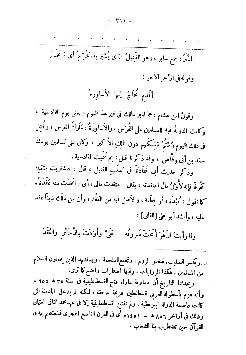 وَقَوْلُ ابْنِ هِشَامٍ: هُمَا لِغَيْرِ مَالِكٍ فِي غَيْرِ هَذَا الْيَوْمِ، يَعْنِي يَوْمَ الْقَادِسِيّةِ، وَكَانَتْ الدّوْلَةُ فِيهِ لِلْمُسْلِمِينَ عَلَى الْفُرْسِ، وَالْأَسَاوِرَةُ: مُلُوكُ الْفُرْسِ، وَقُتِلَ فِي ذَلِكَ الْيَوْمِ رُسْتُمُ مَلِكُهُمْ دُونَ الْمَلِكِ الْأَكْبَرِ، وَكَانَ عَلَى الْمُسْلِمِينَ يَوْمَئِذٍ سَعْدُ بْنُ أَبِي وَقّاصٍ، وَقَدْ ذَكَرْنَا قَبْلُ: بِمَ سُمّيَتْ الْقَادِسِيّةُ.