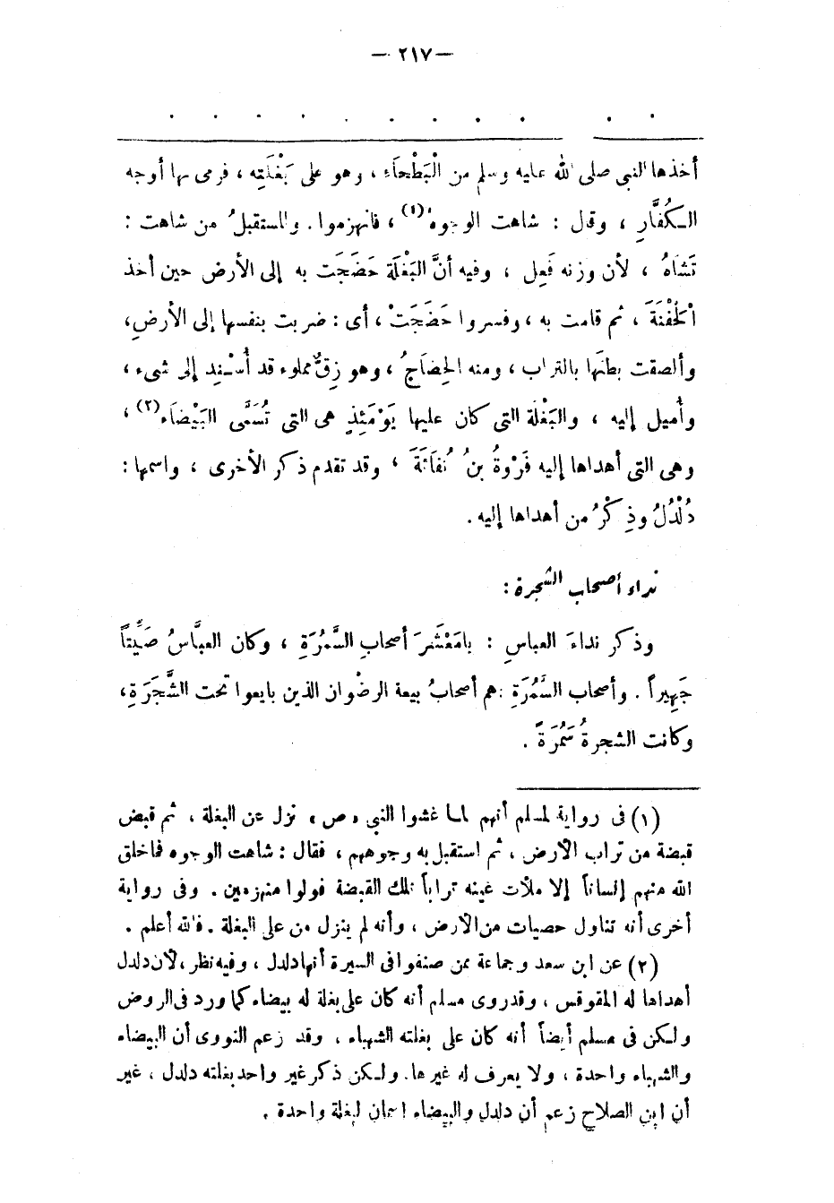 (2) عن ابن سعد وجماعة ممن صنفوا فى السيرة أنها دلدل، وفيه نظر، لأن دلدل أهداها له المقوقس، وقد روى مسلم أنه كان على بغلة له بيضاء كما ورد فى الروض ولكن فى مسلم أيضا أنه كان على بغلته الشهباء، وقد زعم النووى أن البيضاء والشهباء واحدة، ولا يعرف له غيرها، ولكن ذكر غير واحد بغلته دلدل، غير أن ابن الصلاح زعم أن دلدل والبيضاء اسمان لبغلة واحدة.