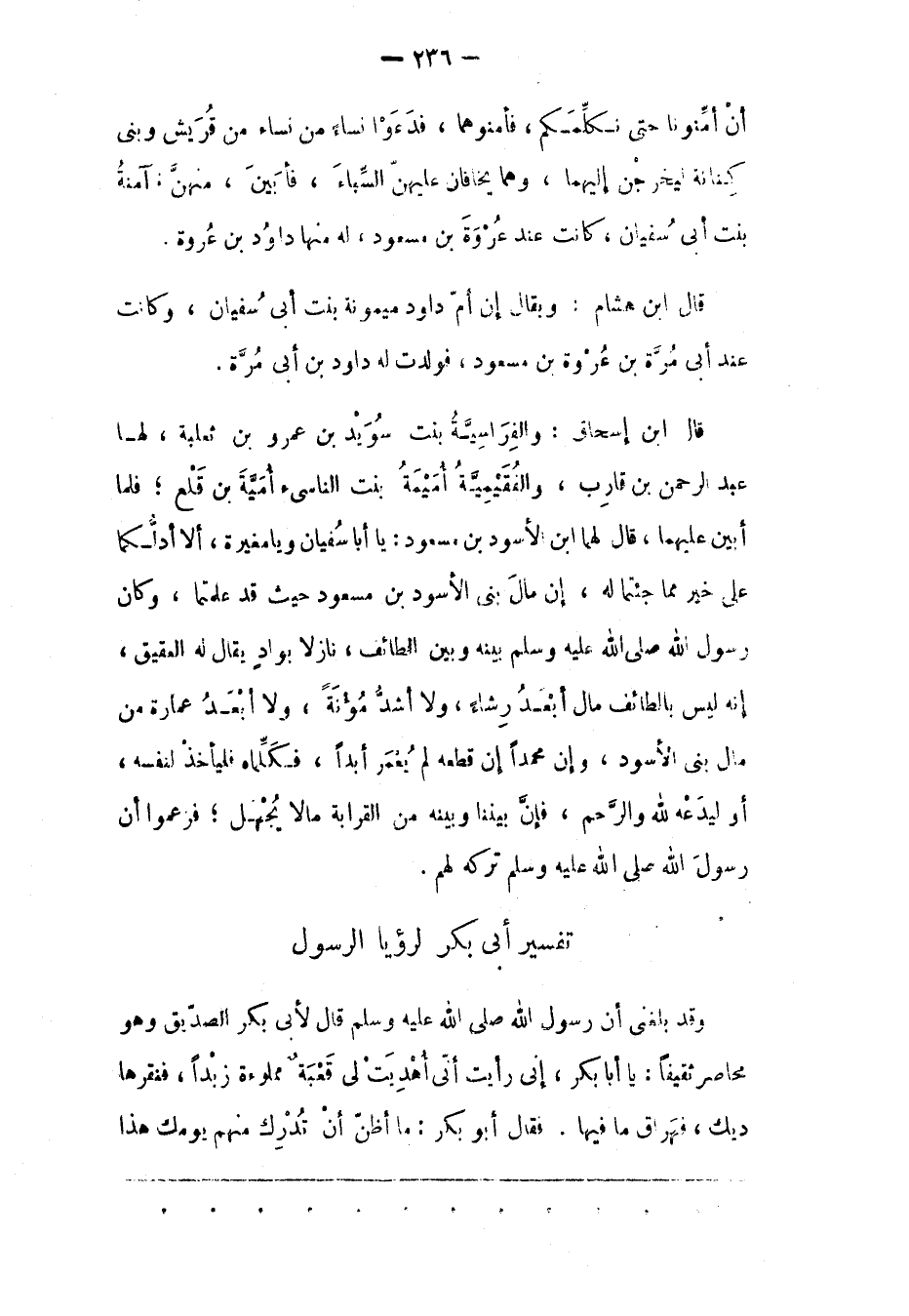 وَقَدْ بَلَغَنِي أَنّ رَسُولَ اللهِ صَلّى اللهُ عَلَيْهِ وَسَلّمَ قَالَ لِأَبِي بَكْرٍ الصّدّيقِ وَهُوَ مُحَاصِرٌ ثَقِيفًا: يَا أَبَا بَكْرٍ، إنّي رَأَيْت أَنّي أُهْدِيَتْ لِي قَعْبَةٌ مَمْلُوءَةٌ زُبْدًا، فَنَقَرَهَا دِيكٌ، فَهَرَاقَ مَا فِيهَا. فَقَالَ أَبُو بَكْرٍ: مَا أَظُنّ أَنْ تُدْرِكَ مِنْهُمْ يَوْمَك هَذَا