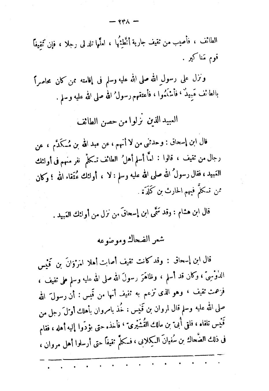 قال ابن إسحاق: وحدثنى من لا أنهم، عَنْ عَبْدِ اللهِ بْنِ مُكَدّمٍ، عَنْ رِجَالٍ مِنْ ثَقِيفٍ، قَالُوا: لَمّا أَسْلَمَ أَهْلُ الطّائِفِ تَكَلّمَ نَفَرٌ مِنْهُمْ فِي أُولَئِكَ الْعَبِيدِ، فَقَالَ رَسُولُ اللهِ صَلَّى اللَّهُ عَلَيْهِ وَسَلَّمَ: لا، أُولَئِكَ عُتَقَاءُ اللهِ؛ وَكَانَ مِمّنْ تَكَلّمَ فِيهِمْ الْحَارِثُ بْنُ كَلَدَةَ