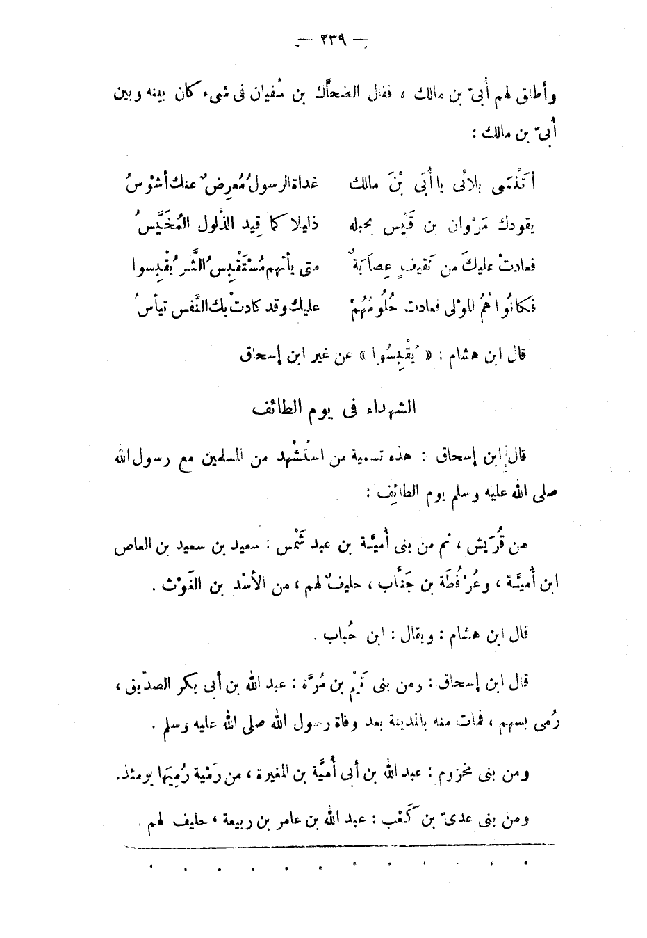 قال ابن إسحاق: هذه تَسْمِيَةُ مَنْ اُسْتُشْهِدَ مِنْ الْمُسْلِمِينَ مَعَ رَسُولِ اللهِ صَلَّى اللَّهُ عَلَيْهِ وَسَلَّمَ يَوْمَ الطّائِفِ: