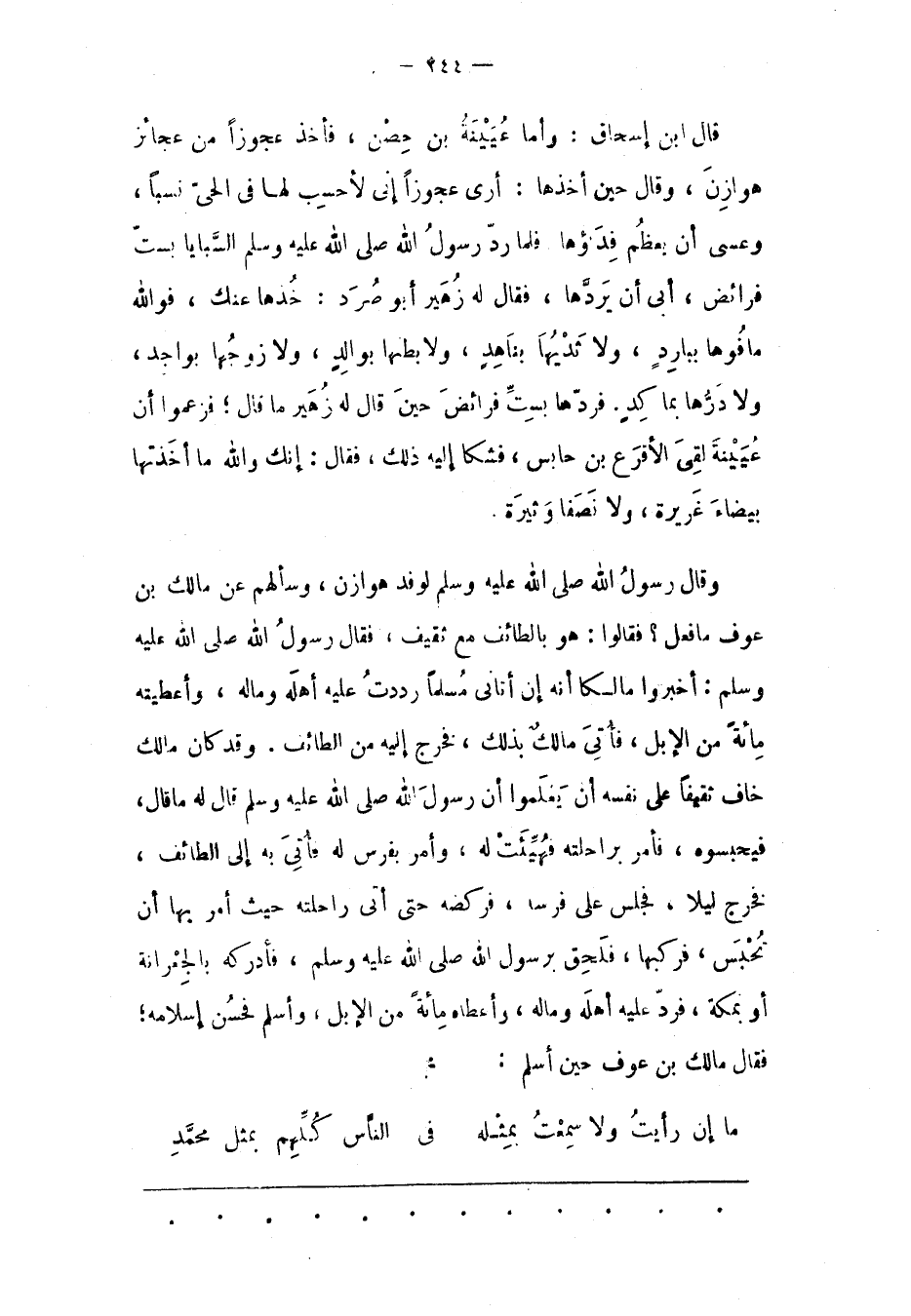 وَقَالَ رَسُولُ اللهِ صَلَّى اللَّهُ عَلَيْهِ وَسَلَّمَ لوفد هوازن، وَسَأَلَهُمْ عَنْ مَالِكِ بْنِ عَوْفٍ مَا فَعَلَ؟ فَقَالُوا: هُوَ بِالطّائِفِ مَعَ ثَقِيفٍ، فَقَالَ رَسُولُ اللهِ صَلَّى اللَّهُ عَلَيْهِ وَسَلَّمَ: أَخْبِرُوا مَالِكًا أَنّهُ إنْ أَتَانِي مُسْلِمًا رَدَدْت عَلَيْهِ أَهْلَهُ وماله، وأعطيته مائة مِنْ الْإِبِلِ، فَأَتَى مَالِكٌ بِذَلِكَ، فَخَرَجَ إلَيْهِ مِنْ الطّائِفِ. وَقَدْ كَانَ مَالِكٌ خَافَ ثَقِيفًا عَلَى نَفْسِهِ أَنْ يَعْلَمُوا أَنّ رَسُولَ اللهِ صَلّى اللهُ عَلَيْهِ وَسَلّمَ قَالَ لَهُ مَا قَالَ، فَيَحْبِسُوهُ، فَأَمَرَ بِرَاحِلَتِهِ فَهُيّئَتْ لَهُ، وَأَمَرَ بِفَرَسِ لَهُ فَأُتِيَ بِهِ إلَى الطّائِفِ، فَخَرَجَ ليلا، فجلس على فرسا، فَرَكَضَهُ حَتّى أَتَى رَاحِلَتَهُ حَيْثُ أَمَرَ بِهَا أَنْ تُحْبَسَ، فَرَكِبَهَا، فَلَحِقَ بِرَسُولِ اللهِ صَلّى اللهُ عَلَيْهِ وَسَلّمَ، فَأَدْرَكَهُ بِالْجِعْرَانَةِ أَوْ بِمَكّةَ، فردّ عليه أهله وماله، وأعطاه مائة مِنْ الْإِبِلِ، وَأَسْلَمَ فَحَسُنَ إسْلَامُهُ؛ فَقَالَ مَالِكُ بْنُ عَوْفٍ حِينَ أَسْلَمَ: