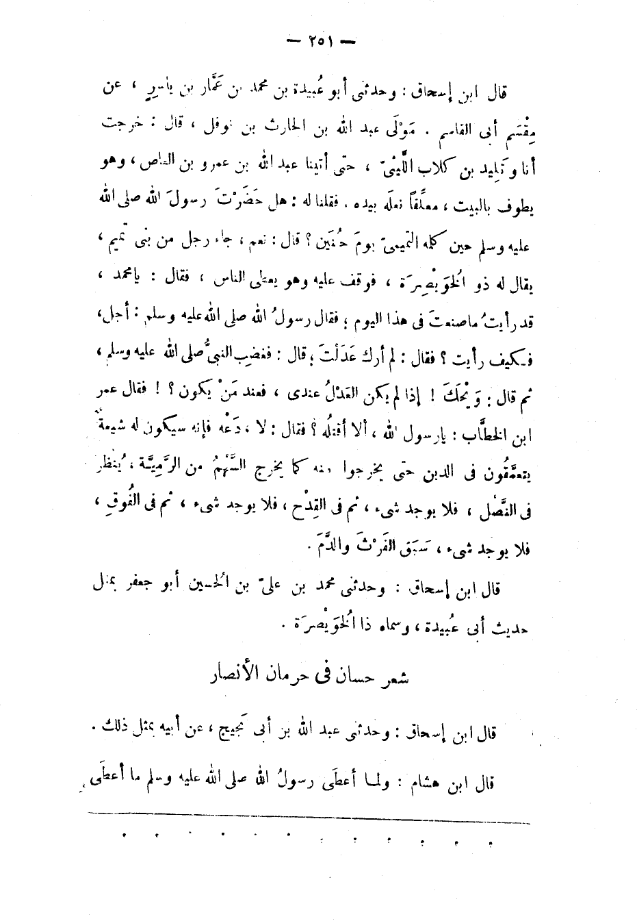 قَالَ ابْنُ إسْحَاقَ: وَحَدّثَنِي أَبُو عُبَيْدَةَ بْنُ مُحَمّدِ بْنِ عَمّارِ بْنِ يَاسِرٍ، عَنْ مِقْسَمِ أَبِي الْقَاسِمِ، مَوْلَى عَبْدِ اللهِ بْنِ الْحَارِثِ بْنِ نَوْفَلٍ، قَالَ: خَرَجْت أَنَا وَتَلِيدُ بْنُ كِلَابٍ اللّيْثِيّ، حَتّى أَتَيْنَا عَبْدَ اللهِ بْنَ عَمْرِو بْنِ الْعَاصِ، وَهُوَ يَطُوفُ بِالْبَيْتِ، مُعَلّقًا نَعْلَهُ بِيَدِهِ، فَقُلْنَا لَهُ: هَلْ حَضَرْتَ رَسُولَ اللهِ صَلّى اللهُ عَلَيْهِ وَسَلّمَ حِينَ كَلّمَهُ التّمِيمِيّ يَوْمَ حُنَيْنٍ؟ قَالَ: نَعَمْ، جَاءَ رَجُلٌ مِنْ بَنِي تَمِيمٍ، يُقَالُ لَهُ ذُو الْخُوَيْصِرَةِ، فَوَقَفَ عَلَيْهِ وَهُوَ يُعْطِي النّاسَ، فَقَالَ: يَا مُحَمّدُ، قَدْ رَأَيْتُ مَا صَنَعْتَ فِي هَذَا اليوم؛ فَقَالَ رَسُولُ اللهِ صَلَّى اللَّهُ عَلَيْهِ وَسَلَّمَ: أَجَلْ، فَكَيْفَ رَأَيْت؟ فَقَالَ: لَمْ أَرَك عَدَلْت؛ قَالَ: فَغَضِبَ النّبِيّ صَلَّى اللَّهُ عَلَيْهِ وَسَلَّمَ، ثُمّ قَالَ: وَيْحَك! إذَا لَمْ يَكُنْ الْعَدْلُ عِنْدِي، فَعِنْدَ مَنْ يَكُونُ؟! فَقَالَ عُمَرُ ابن الْخَطّابِ: يَا رَسُولَ اللهِ، أَلَا أَقْتُلُهُ؟ فَقَالَ: لَا، دَعْهُ فَإِنّهُ سَيَكُونُ لَهُ شِيعَةٌ يَتَعَمّقُونَ فِي الدّينِ حَتّى يَخْرُجُوا مِنْهُ كَمَا يَخْرُجُ السّهْمُ مِنْ الرّمِيّةِ، يُنْظَرُ فِي النّصْلِ، فَلَا يوجد شىء، ثم فى القدح، فَلَا يُوجَدُ شَيْءٌ، ثُمّ فِي الْفُوقِ، فَلَا يوجد شىء، سبق الفرث والدّم.