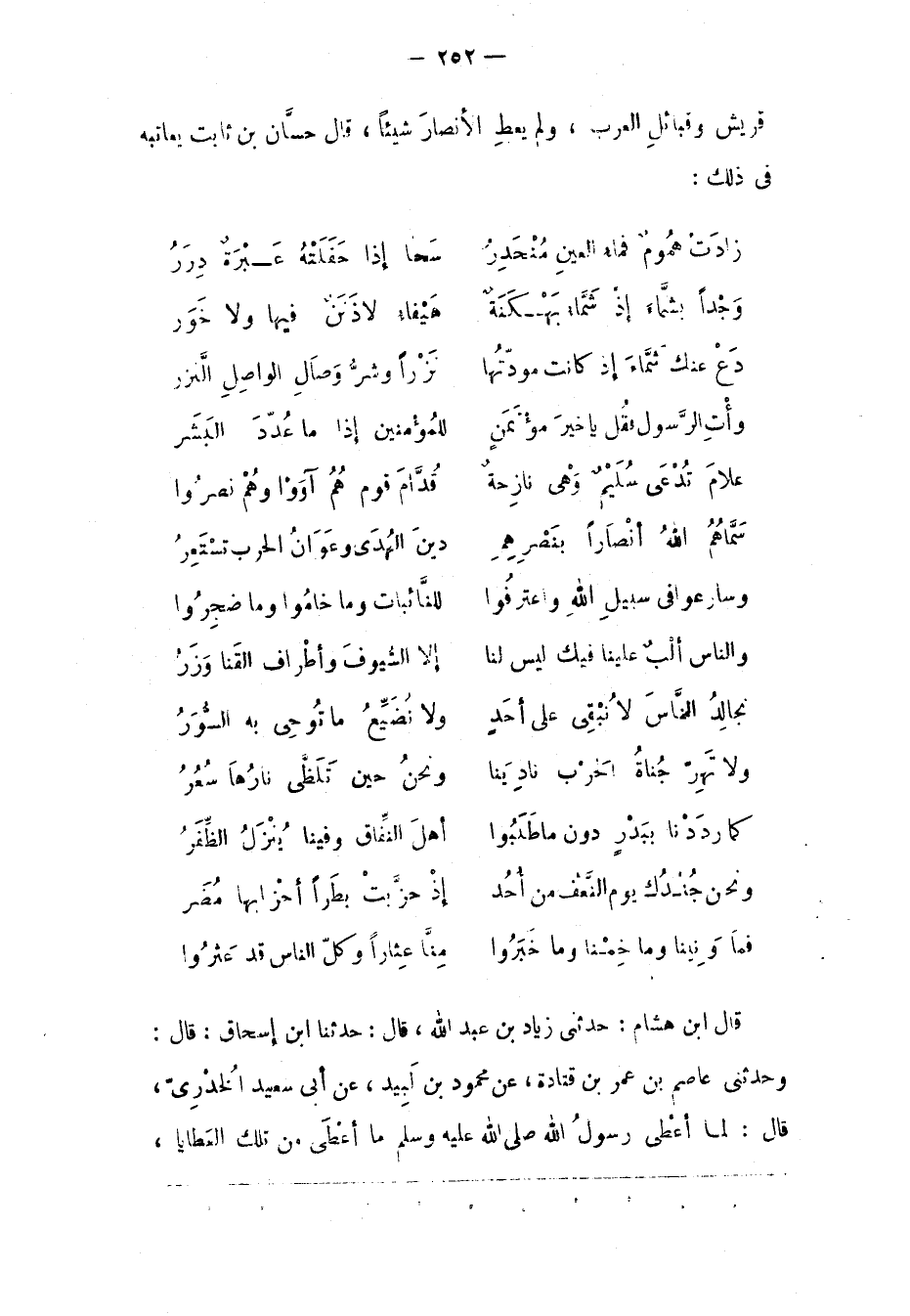 قُرَيْشٍ وَقَبَائِلِ الْعَرَبِ، وَلَمْ يُعْطِ الْأَنْصَارَ شَيْئًا، قَالَ حَسّانُ بْنُ ثَابِتٍ يُعَاتِبُهُ فِي ذَلِكَ: