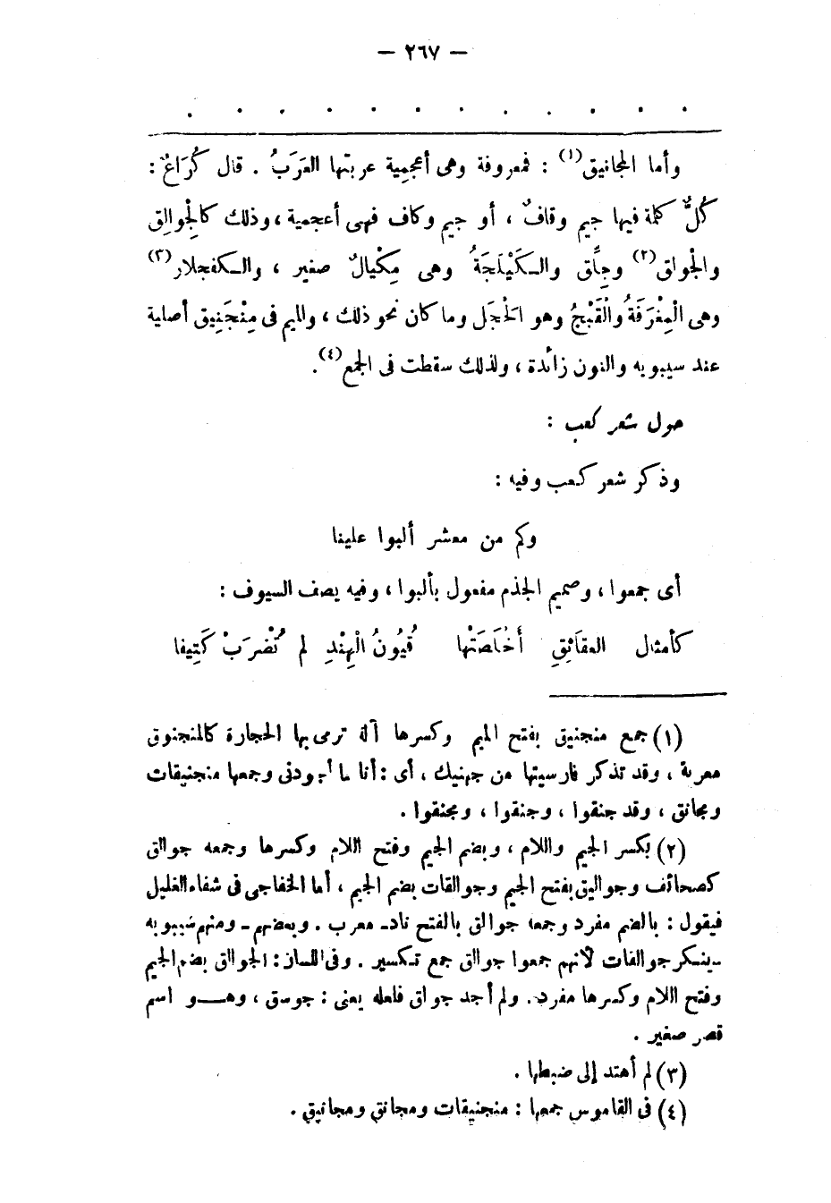 كُلّ كَلِمَةٍ فِيهَا جِيمٌ وَقَافٌ، أَوْ جِيمٌ وَكَافٌ فَهِيَ أَعْجَمِيّةٌ، وَذَلِكَ كَالْجُوَالِقِ وَالْجَوْلَقِ «2» وَجِلّقٍ وَالْكَيْلَجَةِ وَهِيَ مِكْيَالٌ صَغِيرٌ، وَالْكَفْجَلَارُ «3» وَهِيَ الْمِغْرَفَةُ وَالْقَبْجُ وَهُوَ الْحَجَلُ وَمَا كَانَ نَحْوَ ذَلِكَ، وَالْمِيمُ فِي مَنْجَنِيقٍ أَصْلِيّةٌ عِنْدَ سِيبَوَيْهِ وَالنّونُ زَائِدَةٌ، وَلِذَلِكَ سَقَطَتْ فِي الْجَمْعِ «4» .