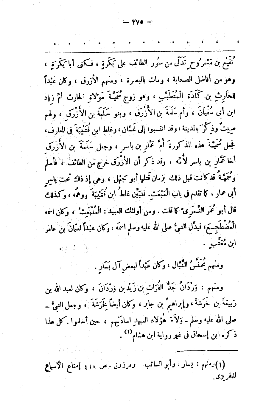 نُفَيْعُ بْنُ مَسْرُوحٍ تَدَلّى مِنْ سُوَرِ الطّائِفِ عَلَى بَكْرَةٍ، فَكُنّيَ أَبَا بَكْرَةَ، وَهُوَ مِنْ أَفَاضِلِ الصّحَابَةِ، وَمَاتَ بِالْبَصْرَةِ، وَمِنْهُمْ الْأَزْرَقُ، وَكَانَ عَبْدًا لِلْحَارِثِ بْنِ كَلَدَةَ الْمُتَطَبّبُ، وَهُوَ زَوْجُ سميّة مولاة الحارث أمّ زياد ابن أَبِي سُفْيَانَ، وَأُمّ سَلَمَةَ بْنِ الْأَزْرَقِ، وَبَنُو سَلَمَةَ بْنُ الْأَزْرَقِ، وَلَهُمْ صِيتٌ وَذِكْرٌ بِالْمَدِينَةِ، وَقَدْ انْتَسَبُوا إلَى غَسّانَ، وَغَلِطَ ابْنُ قُتَيْبَةَ فِي الْمَعَارِفِ، فَجَعَلَ سُمَيّةَ هَذِهِ الْمَذْكُورَةَ أُمّ عَمّارِ بْنِ يَاسِرٍ، وَجَعَلَ سَلَمَةَ بْنَ الْأَزْرَقِ أَخَا عَمّارِ بْنِ يَاسِرٍ لِأُمّهِ، وَقَدْ ذَكَرَ أَنّ الْأَزْرَقَ خَرَجَ مِنْ الطّائِفِ، فَأَسْلَمَ وَسُمَيّةُ قَدْ كَانَتْ قَبْلَ ذَلِكَ بِزَمَانٍ قَتَلَهَا أَبُو جَهْلٍ، وَهِيَ إذْ ذَاكَ تَحْتَ يَاسِرٍ أَبِي عَمّارٍ، كَمَا تَقَدّمَ فِي بَابِ الْمَبْعَثِ. فَتَبَيّنَ غَلَطُ ابْنِ قُتَيْبَةَ وَوَهْمُهُ، وَكَذَلِكَ قَالَ أَبُو عُمَرَ النّمِرِيّ كَمَا قُلْت. وَمِنْ أُولَئِكَ الْعَبِيدِ: الْمُنْبَعِثُ، وَكَانَ اسْمُهُ الْمُضْطَجِعُ، فَبَدّلَ النّبِيّ صَلَّى اللَّهُ عَلَيْهِ وَسَلَّمَ اسْمَهُ، وَكَانَ عَبْدًا لِعُثْمَانِ بن عامر ابن مُعَتّبٍ.