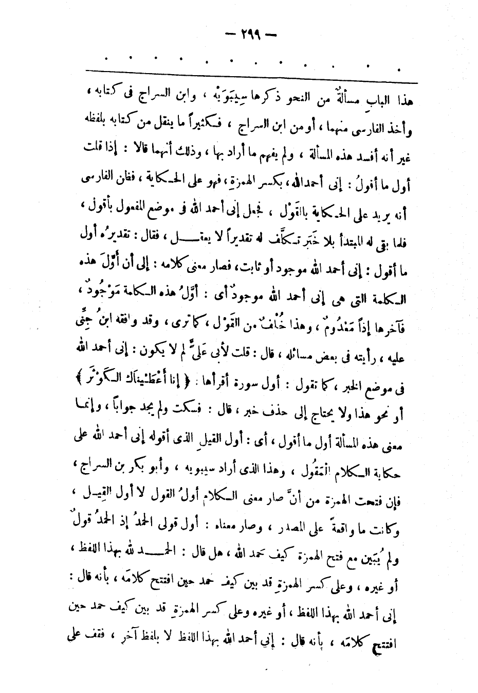 هَذَا الْبَابِ مَسْأَلَةٌ مِنْ النّحْوِ ذَكَرَهَا سِيبَوَيْهِ، وَابْنُ السّرَاجِ فِي كِتَابِهِ، وَأَخَذَ الْفَارِسِيّ مِنْهُمَا، أَوْ مِنْ ابْنِ السّرَاجِ، فَكَثِيرًا مَا يَنْقُلُ مِنْ كِتَابِهِ بِلَفْظِهِ غَيْرَ أَنّهُ أَفْسَدَ هَذِهِ الْمَسْأَلَةَ، وَلَمْ يَفْهَمْ مَا أَرَادَ بِهَا، وَذَلِكَ أَنّهُمَا قَالَا: إذَا قُلْت أَوّلَ مَا أَقُولُ: إنّي أَحْمَدُ اللهَ، بِكَسْرِ الْهَمْزَةِ، فَهُوَ عَلَى الْحِكَايَةِ، فَظَنّ الْفَارِسِيّ أَنّهُ يُرِيدُ عَلَى الْحِكَايَةِ بِالْقَوْلِ، فَجَعَلَ إنّي أَحْمَدُ اللهَ فِي مَوْضِعِ الْمَفْعُولِ بِأَقُولُ، فَلَمّا بَقِيَ لَهُ الْمُبْتَدَأُ بِلَا خَبَرٍ تَكَلّفَ لَهُ تَقْدِيرًا لَا يُعْقَلُ، فَقَالَ: تَقْدِيرُهُ أَوّلُ مَا أَقُولُ: إنّي أَحْمَدُ اللهَ مَوْجُودٌ أَوْ ثَابِتٌ، فَصَارَ مَعْنَى كَلَامِهِ: إلَى أَنّ أَوّلَ هَذِهِ الْكَلِمَةِ الّتِي هِيَ إنّي أَحْمَدُ اللهَ مَوْجُودٌ أَيْ: أَوّلُ هَذِهِ الْكَلِمَةِ مَوْجُودٌ، فَآخِرُهَا إذًا مَعْدُومٌ، وَهَذَا خُلْفٌ مِنْ الْقَوْلِ، كَمَا تَرَى، وَقَدْ وَافَقَهُ ابْنُ جِنّي عَلَيْهِ، رَأَيْته فِي بَعْضِ مَسَائِلِهِ، قَالَ: قُلْت لِأَبِي عَلِيّ لِمَ لَا يَكُونُ: إنّي أَحْمَدُ اللهَ فِي مَوْضِعِ الْخَبَرِ، كَمَا تَقُولُ: أَوّلُ سورة أقرأها: إِنَّا أَعْطَيْناكَ الْكَوْثَرَ أَوْ نَحْوَ هَذَا وَلَا يَحْتَاجُ إلَى حَذْفِ خَبَرٍ، قَالَ: فَسَكَتَ وَلَمْ يَجِدْ جَوَابًا، وَإِنّمَا مَعْنَى هَذِهِ الْمَسْأَلَةِ أَوّلُ مَا أَقُولُ، أَيْ: أَوّلُ الْقِيلِ الّذِي أَقُولُهُ إنّي أَحْمَدُ اللهَ عَلَى حِكَايَةِ الْكَلَامِ الْمَقُولِ، وَهَذَا الّذِي أَرَادَ سِيبَوَيْهِ، وَأَبُو بَكْرِ بْنُ السّرَاجِ، فَإِنْ فَتَحْت الْهَمْزَةَ مِنْ أَنّ صَارَ مَعْنَى الْكَلَامِ أَوّلُ الْقَوْلِ لَا أَوّلُ الْقِيلِ، وَكَانَتْ مَا وَاقِعَةً عَلَى الْمَصْدَرِ، وَصَارَ مَعْنَاهُ: أَوّلُ قَوْلِي الْحَمْدُ إذْ الْحَمْدُ قَوْلٌ وَلَمْ يُبَيّنْ مَعَ فَتْحِ الْهَمْزَةِ كَيْفَ حَمِدَ اللهَ، هَلْ قَالَ: الْحَمْدُ لِلّهِ بِهَذَا اللّفْظِ، أَوْ غَيْرِهِ، وَعَلَى كَسْرِ الْهَمْزَةِ قَدْ بَيّنَ كَيْفَ حَمِدَ حِينَ افْتَتَحَ كَلَامَهُ، بِأَنّهُ قَالَ: