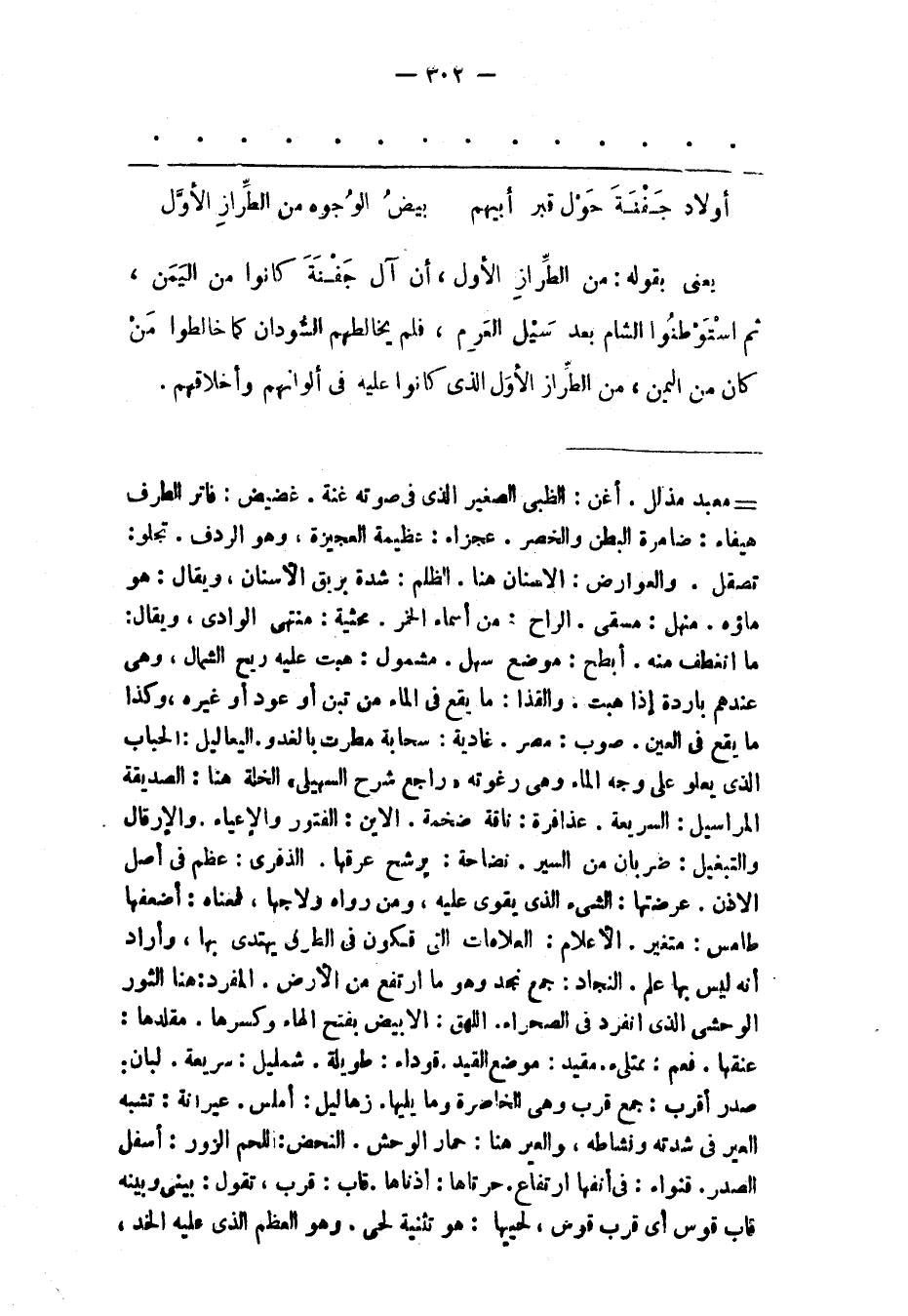 يَعْنِي بِقَوْلِهِ: مِنْ الطّرَازِ الْأَوّلِ، أَنّ آلَ جَفْنَةَ كَانُوا مِنْ الْيَمَنِ، ثُمّ اسْتَوْطَنُوا الشّامَ بَعْدَ سَيْلِ الْعَرِمِ، فَلَمْ يُخَالِطْهُمْ السّودَانُ كَمَا خَالَطُوا مَنْ كَانَ مِنْ الْيَمَنِ، مِنْ الطّرَازِ الْأَوّلِ الّذِي كَانُوا عَلَيْهِ فى ألوانهم وأخلاقهم.