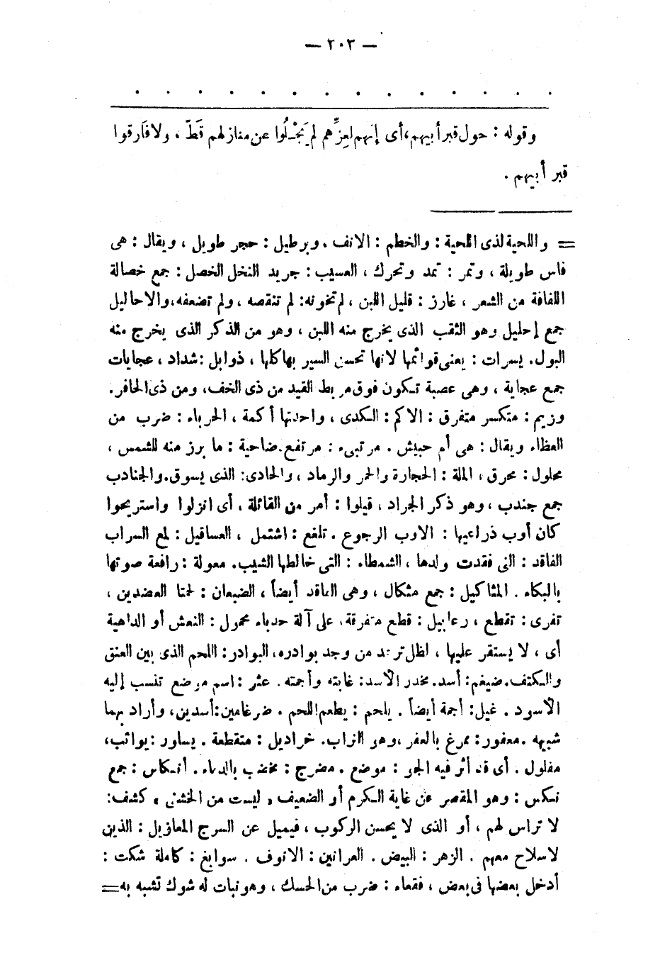 - واللحية لذى اللحية: والخطم: الانف، وبرطيل: حجر طويل، ويقال: هى فاس طويلة، وتمر: تمد وتحرك، العسيب: جريد النخل الخصل: جمع خصالة اللفافة من الشعر، غارز: قليل اللبن، لم تخونه: لم تنقصه، ولم تضعفه، والاحاليل جمع إحليل وهو الثقب الذى يخرج منه اللبن، وهو من الذكر الذى يخرج منه البول. يسرات: يعنى قوائمها لانها تحسن السير بها كلها، ذوابل: شداد، عجايات جمع عجاية، وهى عصبة تكون فوق مربط القيد من ذى الخف، ومن ذى الحافر. وزيم: متكسر متفرق: الاكم: الكدى، واحدتها أكمة، الحرباء: ضرب من العظاء ويقال: هى أم حبيش. مرتبئ: مرتفع. ضاحية: ما برز منه للشمس، محلول: محرق، الملة: الحجارة والحمر والرماد، والحادى: الذى يسوق. والجنادب جمع جندب، وهو ذكر الجراد، قيلوا: أمر من القائلة، أى انزلوا واستريحوا كان أوب ذراعيها: الاوب الرجوع. تلغع: اشتمل، العساقيل: لمع السراب الفاقد: التى فقدت ولدها، الشمطاء: التى خالطها الشيب. معولة: رافعة صوتها بالبكاء. المثاكيل: جمع مثكال، وهى الفاقد أيضا، الضبعان: لحمتا العضدين، تفرى: تقطع، رعابيل: قطع متفرقة، على آلة حدباء محمول: النعش أو الداهية أى، لا يستقر عليها، لظل ترعد من وجد بوادره، البوادر: اللحم الذى بين العنق والكتف. ضيغم: أسد. مخدر الأسد: غابته وأجمته. عثر: اسم موضع تنسب إليه الأسود. غيل: أجمة أيضا. يلحم: يطعم اللحم. ضرغامين: أسدين، وأراد بهما شبيهه. معفور: ممرغ بالعفر، وهو التراب. خراديل: متقطعة. يساور: يواثب، مفلول. أى قد أثر فيه الجو: موضع. مضرج: مخضب بالدماء. أنكاس: جمع نكس: وهو المقصر عن غاية الكرم أو الضعيف «ليست من الخشنى» كشف: لا تراس لهم، أو الذى لا يحسن الركوب، فيميل عن السرج المعازيل: الذين لا سلاح معهم. الزهر: البيض. العرانين: الانوف. سوابغ: كاملة شكت: أدخل بعضها فى بعض، فقعاء: ضرب من الحسك، وهو نبات له شوك تشبه به.