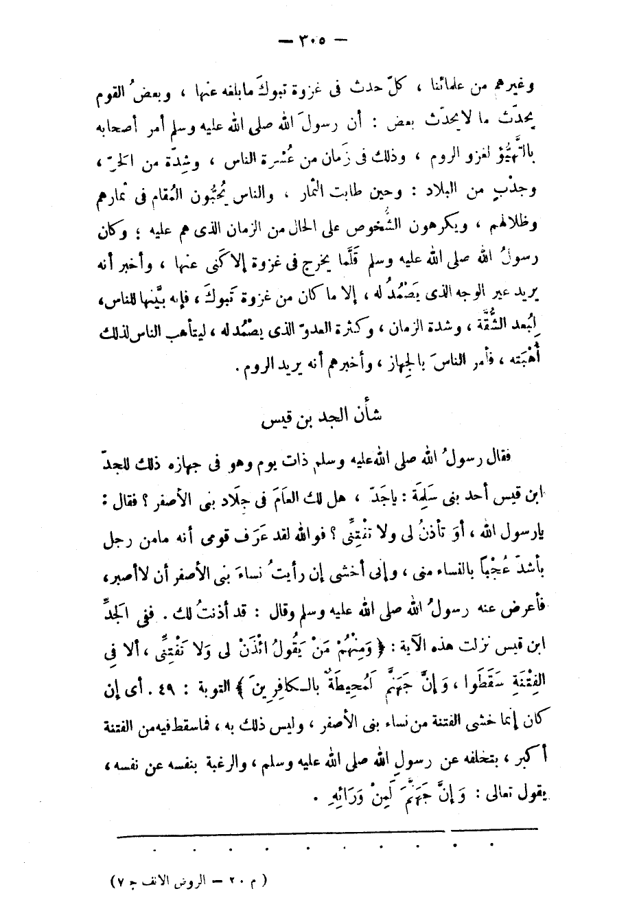 يَا رَسُولَ اللهِ، أَوْ تَأْذَنُ لِي وَلَا تفتنّى؟ فو الله لقد عرف قومى أنه مامن رَجُلٍ بِأَشَدّ عُجْبًا بِالنّسَاءِ مِنّي، وَإِنّي أَخْشَى إنْ رَأَيْتَ نِسَاءَ بَنِي الْأَصْفَرِ أَنْ لَا أَصْبِرَ، فَأَعْرَضَ عَنْهُ رَسُولُ اللهِ صَلَّى اللَّهُ عَلَيْهِ وَسَلَّمَ وَقَالَ: قَدْ أَذِنْتُ لَك. فَفِي الجدّ ابن قِيسٍ نَزَلَتْ هَذِهِ الْآيَةُ: وَمِنْهُمْ مَنْ يَقُولُ ائْذَنْ لِي وَلا تَفْتِنِّي، أَلا فِي الْفِتْنَةِ سَقَطُوا، وَإِنَّ جَهَنَّمَ لَمُحِيطَةٌ بِالْكافِرِينَ التوبة: 49. أَيْ إنْ كَانَ إنّمَا خَشَى الْفِتْنَةَ مِنْ نِسَاءِ بَنِي الْأَصْفَرِ، وَلَيْسَ ذَلِك بِهِ، فَمَا سَقَطَ فِيهِ مِنْ الْفِتْنَةِ أَكْبَرُ، بِتَخَلّفِهِ عَنْ رَسُولِ اللهِ صَلَّى اللَّهُ عَلَيْهِ وَسَلَّمَ، وَالرّغْبَة بِنَفْسِهِ عَنْ نَفْسِهِ، يَقُولُ تَعَالَى: وَإِنّ جَهَنّمَ لمن ورائه.