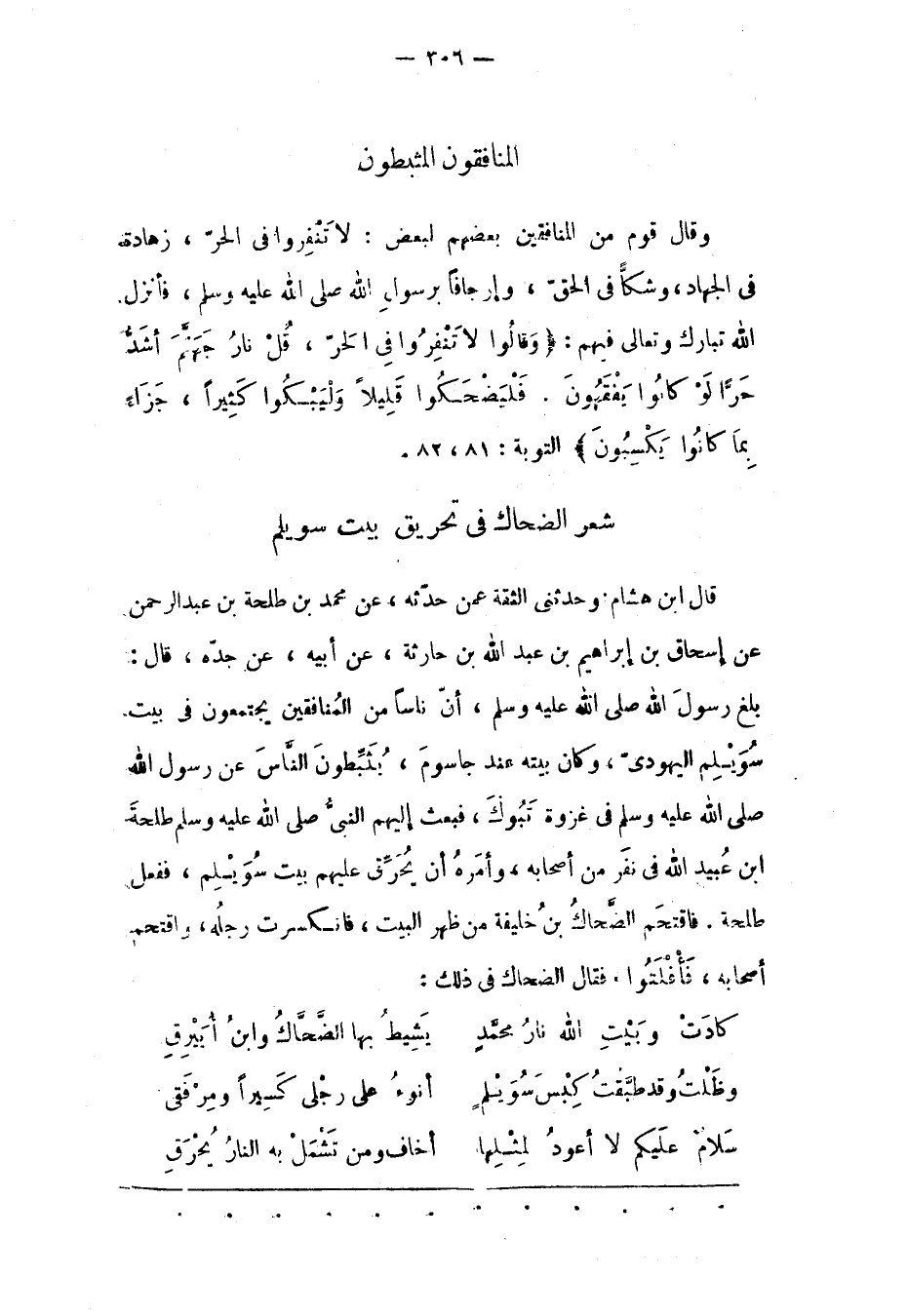 بلغ رسول الله صلى الله عليه وسلم، أَنّ نَاسًا مِنْ الْمُنَافِقِينَ يَجْتَمِعُونَ فِي بَيْتِ سُوَيْلِمٍ الْيَهُودِيّ، وَكَانَ بَيْتُهُ عِنْدَ جَاسُومَ، يُثَبّطُونَ الناس عَنْ رَسُولِ اللهِ صَلَّى اللَّهُ عَلَيْهِ وَسَلَّمَ فِي غَزْوَةِ تَبُوكَ، فَبَعَثَ إلَيْهِمْ النّبِيّ صلى الله عليه وسلم طلحة ابن عُبَيْدِ اللهِ فِي نَفَرٍ مِنْ أَصْحَابِهِ، وَأَمَرَهُ أَنْ يُحَرّقَ عَلَيْهِمْ بَيْتَ سُوَيْلِمٍ، فَفَعَلَ طَلْحَةُ. فَاقْتَحَمَ الضّحّاكُ بْنُ خَلِيفَةَ مِنْ ظَهْرِ الْبَيْتِ، فَانْكَسَرَتْ رِجْلُهُ، وَاقْتَحَمَ أَصْحَابُهُ، فَأَفْلَتُوا. فَقَالَ الضّحّاكُ فِي ذَلِكَ:
