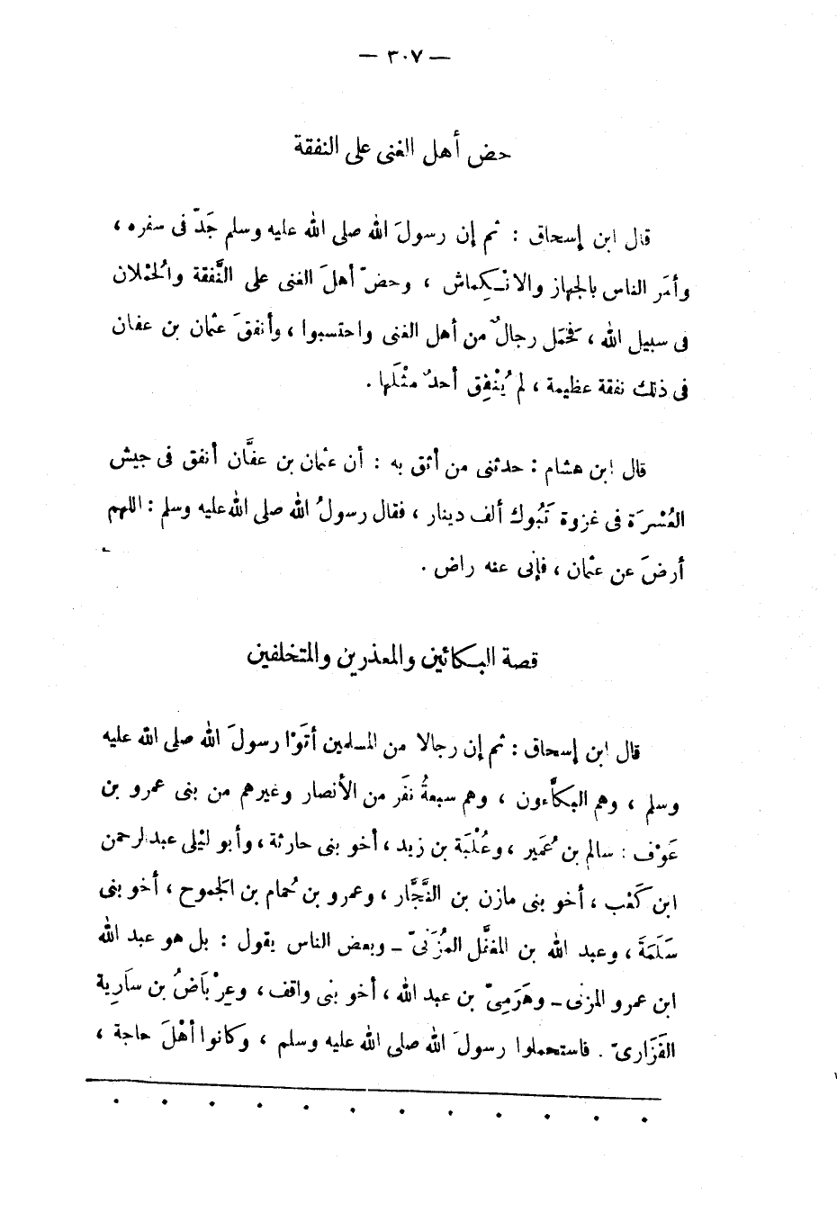 قَالَ ابْنُ هِشَامٍ: حَدّثَنِي مَنْ أَثِقُ بِهِ: أَنّ عُثْمَانَ بْنَ عَفّانَ أَنْفَقَ فِي جَيْشِ الْعُسْرَةِ فِي غَزْوَةِ تَبُوكَ أَلْفَ دِينَارٍ، فَقَالَ رَسُولُ اللهِ صَلَّى اللَّهُ عَلَيْهِ وَسَلَّمَ: اللهُمّ ارْضَ عَنْ عُثْمَانَ، فإنى عنه راض.