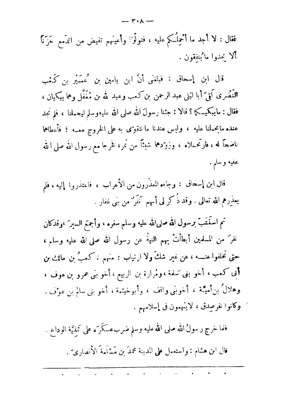 ثُمّ اسْتَتَبّ بِرَسُولِ اللهِ صَلّى اللهُ عَلَيْهِ وَسَلّمَ سَفَرُهُ، وَأَجْمَعَ السّيْرَ، وَقَدْ كَانَ نَفَرٌ مِنْ الْمُسْلِمِينَ أَبْطَأَتْ بِهِمْ النّيّةُ عَنْ رَسُولِ اللهِ صَلَّى اللَّهُ عَلَيْهِ وَسَلَّمَ، حَتّى تَخَلّفُوا عَنْهُ، عَنْ غَيْرِ شَكّ وَلَا ارْتِيَابٍ: مِنْهُمْ: كَعْبُ بْنُ مَالِكِ بْنِ أَبِي كَعْبٍ، أَخُو بَنِي سَلِمَةَ، وَمُرَارَةُ بْنُ الرّبِيعِ، أَخُو بَنِي عَمْرِو بْنِ عَوْفٍ، وَهِلَالُ بْنُ أُمَيّةَ، أَخُو بَنِي وَاقِفٍ، وَأَبُو خَيْثَمَةَ، أَخُو بَنِي سَالِمِ بْنِ عَوْفٍ.