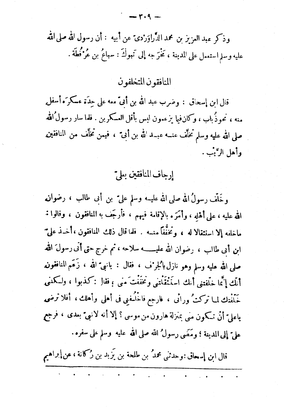 مَا خَلّفَهُ إلّا اسْتِثْقَالًا لَهُ، وَتَخَفّفًا مِنْهُ. فَلَمّا قَالَ ذَلِكَ الْمُنَافِقُونَ، أَخَذَ على ابن أَبِي طَالِبٍ، رِضْوَانُ اللهِ عَلَيْهِ سِلَاحَهُ، ثُمّ خَرَجَ حَتّى أَتَى رَسُولَ اللهِ صَلّى اللهُ عَلَيْهِ وَسَلّمَ وَهُوَ نَازِلٌ بِالْجُرْفِ، فَقَالَ: يَا نَبِيّ اللهِ، زَعَمَ الْمُنَافِقُونَ أَنّكَ إنّمَا خَلّفَتْنِي أَنّك اسْتَثْقَلْتنِي وَتَخَفّفَتْ مِنّي؛ فَقَالَ: كَذَبُوا، وَلَكِنّنِي خَلّفْتُك لِمَا تَرَكْتُ وَرَائِي، فَارْجِعْ فَاخْلُفْنِي فِي أَهْلِي وَأَهْلِك، أَفَلَا تَرْضَى يَا عَلِيّ أَنْ تَكُونَ مِنّي بِمَنْزِلَةِ هَارُونَ مِنْ مُوسَى؟ إلّا أَنّهُ لَا نَبِيّ بَعْدِي، فَرَجَعَ عَلَيّ إلَى الْمَدِينَةِ؛ وَمَضَى رَسُولُ اللهِ صَلّى اللهُ عَلَيْهِ وسلم على سفره.