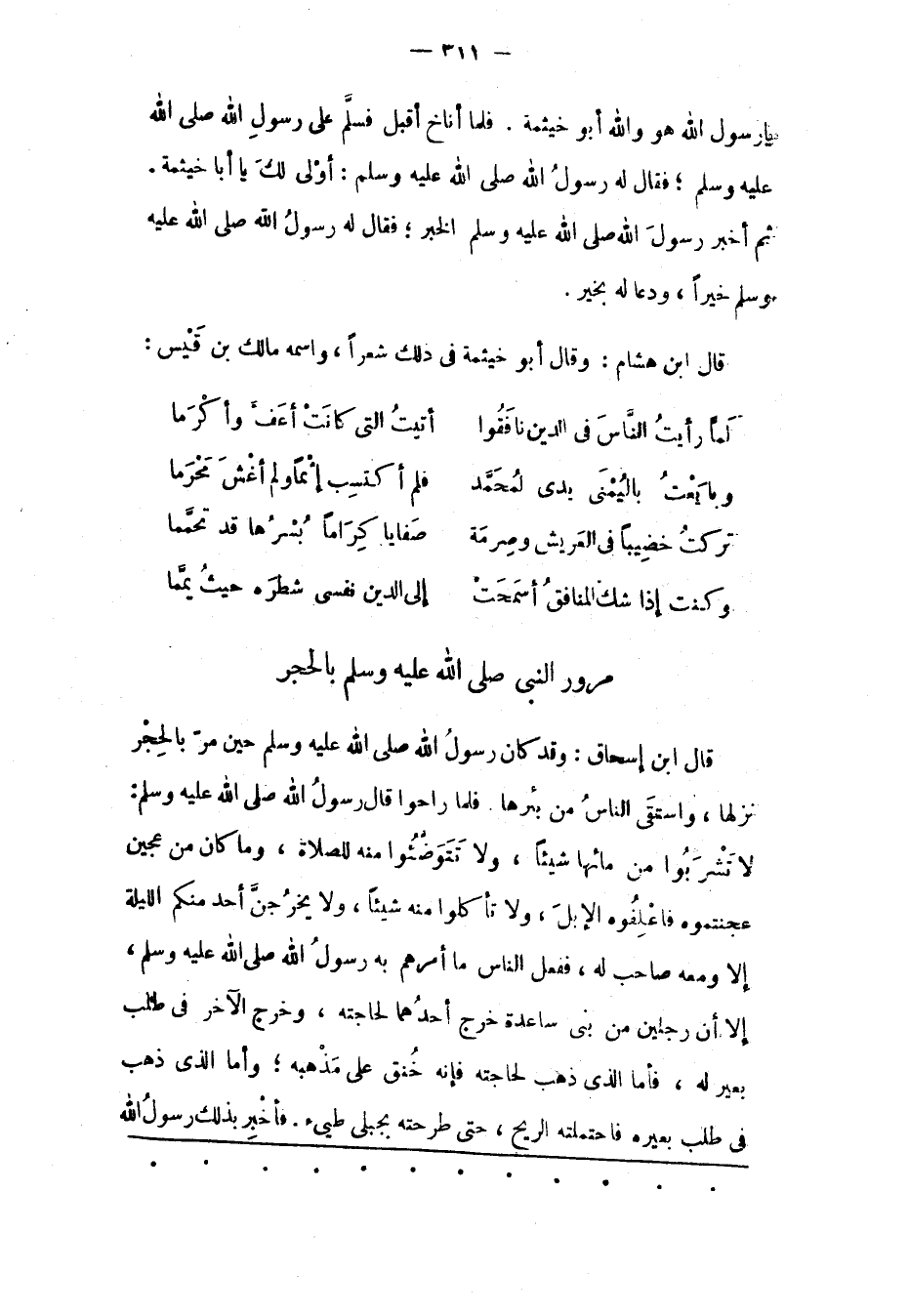 قَالَ ابْنُ إسْحَاقَ: وَقَدْ كَانَ رَسُولُ اللهِ صَلَّى اللَّهُ عَلَيْهِ وَسَلّمَ حِينَ مَرّ بِالْحِجْرِ نَزَلَهَا، وَاسْتَقَى النّاسُ مِنْ بِئْرِهَا. فَلَمّا رَاحُوا قَالَ رَسُولُ اللهِ صَلَّى اللَّهُ عَلَيْهِ وَسَلَّمَ: