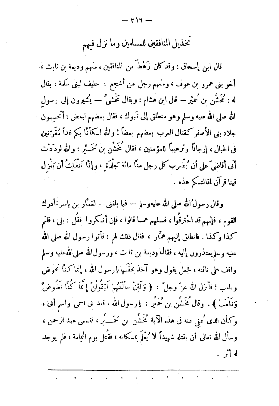 قَالَ ابْنُ إسْحَاقَ: وَقَدْ كَانَ رَهْطٌ مِنْ الْمُنَافِقِينَ، مِنْهُمْ وَدِيعَةُ بْنُ ثَابِتٍ، أَخُو بَنِي عَمْرِو بْنِ عَوْفٍ، وَمِنْهُمْ رَجُلٌ مِنْ أَشْجَعَ، حَلِيفٌ لِبَنِي سَلِمَةَ، يُقَالُ لَهُ: مُخَشّنُ بْنُ حُمَيّر- قَالَ ابْنُ هِشَامٍ: وَيُقَالُ مَخْشِيّ- يُشِيرُونَ إلَى رَسُولِ اللهِ صَلَّى اللَّهُ عَلَيْهِ وَسَلَّمَ وهو مُنْطَلِقٌ إلَى تَبُوكَ، فَقَالَ بَعْضُهُمْ لِبَعْضِ: أَتَحْسِبُونَ جَلّادَ بَنِي الْأَصْفَرِ كَقِتَالِ الْعَرَبِ بَعْضُهُمْ بَعْضًا! وَاَللهِ لَكَأَنّا بِكَمْ غَدًا مُقَرّنِينَ فِي الْحِبَالِ، إرْجَافًا وَتَرْهِيبًا لِلْمُؤْمِنِينَ، فَقَالَ مُخَشّنُ بْنُ حُمَيّرٍ: وَاَللهِ لَوَدِدْت أَنّي أُقَاضِي عَلَى أَنْ يُضْرَبُ كل رجل منّا مائة جَلْدَةٍ، وَإِنّا نَنْفَلِتُ أَنْ يَنْزِلَ فِينَا قُرْآنٌ لِمَقَالَتِكُمْ هَذِهِ.