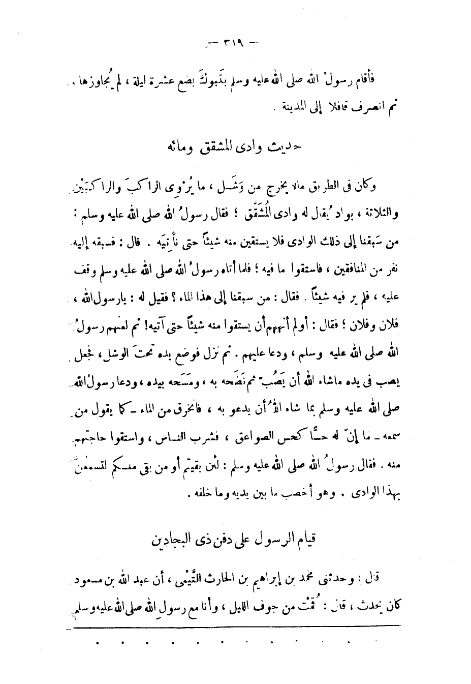 وَكَانَ فِي الطّرِيقِ مَاءٌ يَخْرُجُ مِنْ وَشَلٍ، مَا يَرْوِي الرّاكِبَ وَالرّاكِبَيْنِ وَالثّلَاثَةَ، بِوَادٍ يُقَالُ لَهُ وَادِي الْمُشَقّقِ؛ فَقَالَ رَسُولُ اللهِ صَلَّى اللَّهُ عَلَيْهِ وَسَلَّمَ: