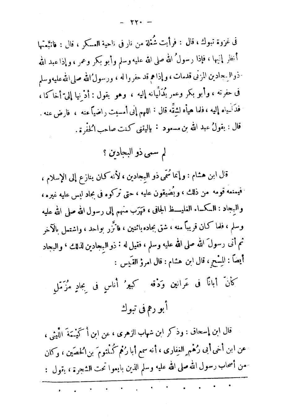 فِي غَزْوَةِ تَبُوكَ، قَالَ: فَرَأَيْت شُعْلَةً مِنْ نَارٍ فِي نَاحِيَةِ الْعَسْكَرِ، قَالَ: فَاتّبَعْتهَا أَنْظُرُ إلَيْهَا، فَإِذَا رَسُولُ اللهِ صَلَّى اللَّهُ عَلَيْهِ وَسَلَّمَ وَأَبُو بَكْرٍ وَعُمَرُ، وَإِذَا عَبْدُ اللهِ ذو النجادين المزنى قدمات، وَإِذَا هُمْ قَدْ حَفَرُوا لَهُ، وَرَسُولُ اللهِ صَلّى اللهُ عَلَيْهِ وَسَلّمَ فِي حُفْرَتِهِ، وَأَبُو بَكْرٍ وَعُمَرُ يُدَلّيَانِهِ إلَيْهِ، وَهُوَ يَقُولُ: أَدْنِيَا إلىّ أخا كما، فَدَلّيَاهُ إلَيْهِ، فَلَمّا هَيّأَهُ لِشِقّهِ قَالَ: اللهُمّ إنّي أَمْسَيْت رَاضِيًا عَنْهُ، فَارْضَ عَنْهُ.