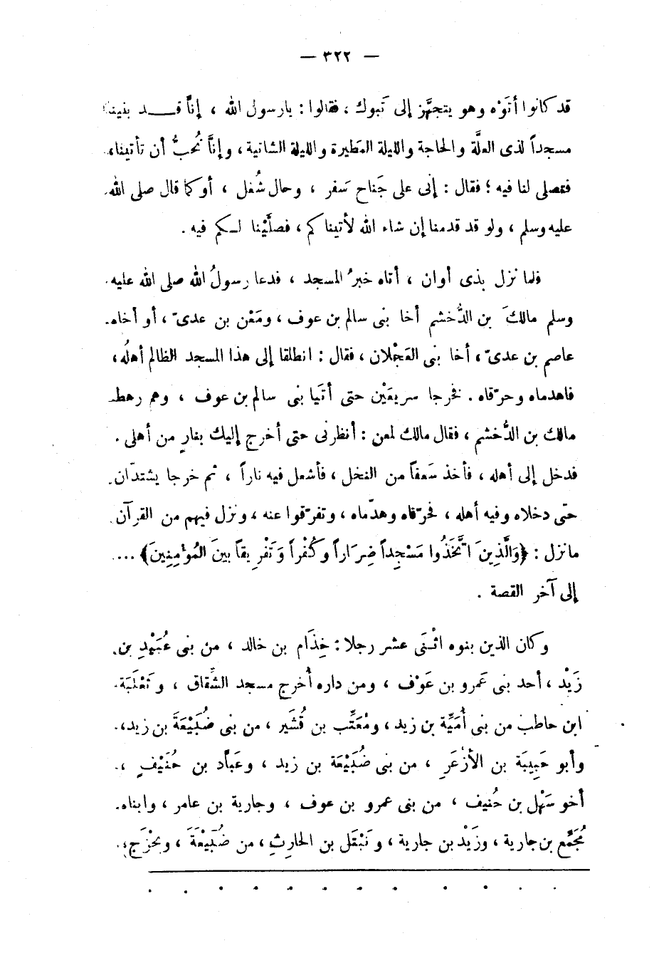 فَدَخَلَ إلَى أَهْلِهِ، فَأَخَذَ سَعَفًا مِنْ النّخْلِ، فَأَشْعَلَ فِيهِ نَارًا، ثُمّ خَرَجَا يَشْتَدّانِ حَتّى دَخَلَاهُ وَفِيهِ أَهْلُهُ، فَحَرّقَاهُ وَهَدّمَاهُ، وَتَفَرّقُوا عَنْهُ، وَنَزَلَ فِيهِمْ مِنْ الْقُرْآنِ مَا نَزَلَ: وَالَّذِينَ اتَّخَذُوا مَسْجِداً ضِراراً وَكُفْراً وَتَفْرِيقاً بَيْنَ الْمُؤْمِنِينَ ...