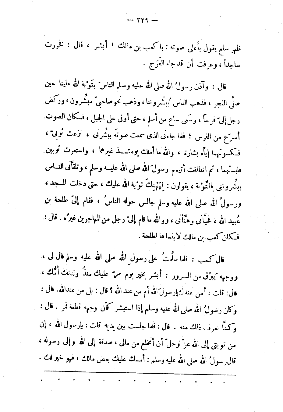 قال: وَآذَنَ رَسُولُ اللهِ صَلَّى اللَّهُ عَلَيْهِ وَسَلَّمَ النّاسَ بِتَوْبَةِ اللهِ عَلَيْنَا حِينَ صَلّى الْفَجْرَ، فَذَهَبَ النّاسُ يُبَشّرُونَنَا، وَذَهَبَ نَحْوَ صَاحِبَيّ مُبَشّرُونَ، وَرَكَضَ رَجُلٌ إلَيّ فَرَسًا. وَسَعَى سَاعٍ مِنْ أسلم، حتى أو فى عَلَى الْجَبَلِ، فَكَانَ الصّوْتُ أَسْرَعَ مِنْ الْفَرَسِ، فَلَمّا جَاءَنِي الّذِي سَمِعْت صَوْتَهُ يُبَشّرُنِي، نَزَعْت ثَوْبَيّ، فَكَسَوْتهمَا إيّاهُ بِشَارَةً، وَاَللهِ مَا أَمْلِكُ يَوْمئِذٍ غَيْرَهُمَا، وَاسْتَعَرْت ثَوْبَيْنِ فَلَبِسْتهمَا، ثُمّ انْطَلَقْت أَتَيَمّمُ رَسُولَ اللهِ صَلّى اللهُ عَلَيْهِ وَسَلّمَ، وَتَلَقّانِي النّاسُ يُبَشّرُونَنِي بِالتّوْبَةِ، يَقُولُونَ: لِيَهْنِكَ تَوْبَةُ اللهِ عَلَيْك، حَتّى دَخَلْت الْمَسْجِدَ، وَرَسُولُ اللهِ صَلّى اللهُ عَلَيْهِ وَسَلّمَ جَالِسٌ حَوْلَهُ النّاسُ، فَقَامَ إلَيّ طَلْحَةُ بْنُ عُبَيْدِ اللهِ، فَحَيّانِي وهنّأنى، وو الله مَا قَامَ إلَيّ رَجُلٌ مِنْ الْمُهَاجِرِينَ غَيْرُهُ. قَالَ: