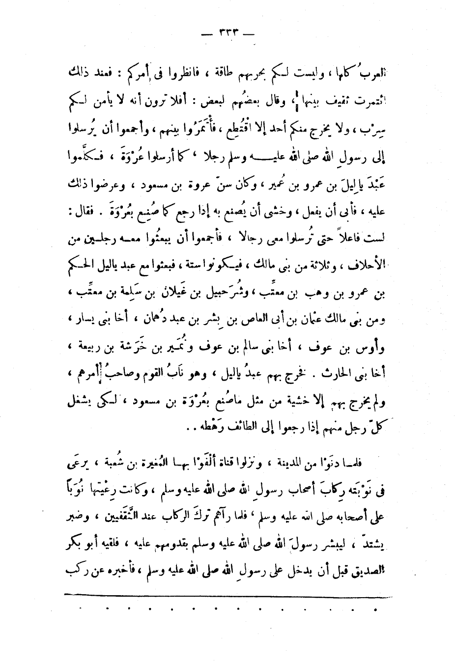الْعَرَبُ كُلّهَا، وَلَيْسَتْ لَكُمْ بِحَرْبِهِمْ طَاقَةٌ، فَانْظُرُوا فِي أَمْرِكُمْ: فَعِنْدَ ذَلِكَ ائْتَمَرَتْ ثَقِيفٌ بَيْنَهَا، وقال بعضهم لبعض: أفلا ترون أنه لا يأمن لكم سرب، ولا يخرج منكم أَحَدٌ إلّا اُقْتُطِعَ، فَأْتَمِرُوا بَيْنَهُمْ، وَأَجْمَعُوا أَنْ يُرْسِلُوا إلَى رَسُولِ اللهِ صَلَّى اللَّهُ عَلَيْهِ وَسَلَّمَ رَجُلًا، كَمَا أَرْسَلُوا عُرْوَةَ، فَكَلّمُوا عَبْدَ يَالَيْلَ بْنِ عَمْرِو بْنِ عُمَيْرٍ، وَكَانَ سِنّ عُرْوَةَ بْنِ مَسْعُودٍ، وَعَرَضُوا ذَلِكَ عَلَيْهِ، فَأَبَى أَنْ يَفْعَلَ، وَخَشِيَ أَنْ يُصْنَعَ بِهِ إذَا رَجَعَ كَمَا صُنِعَ بِعُرْوَةِ. فَقَالَ: